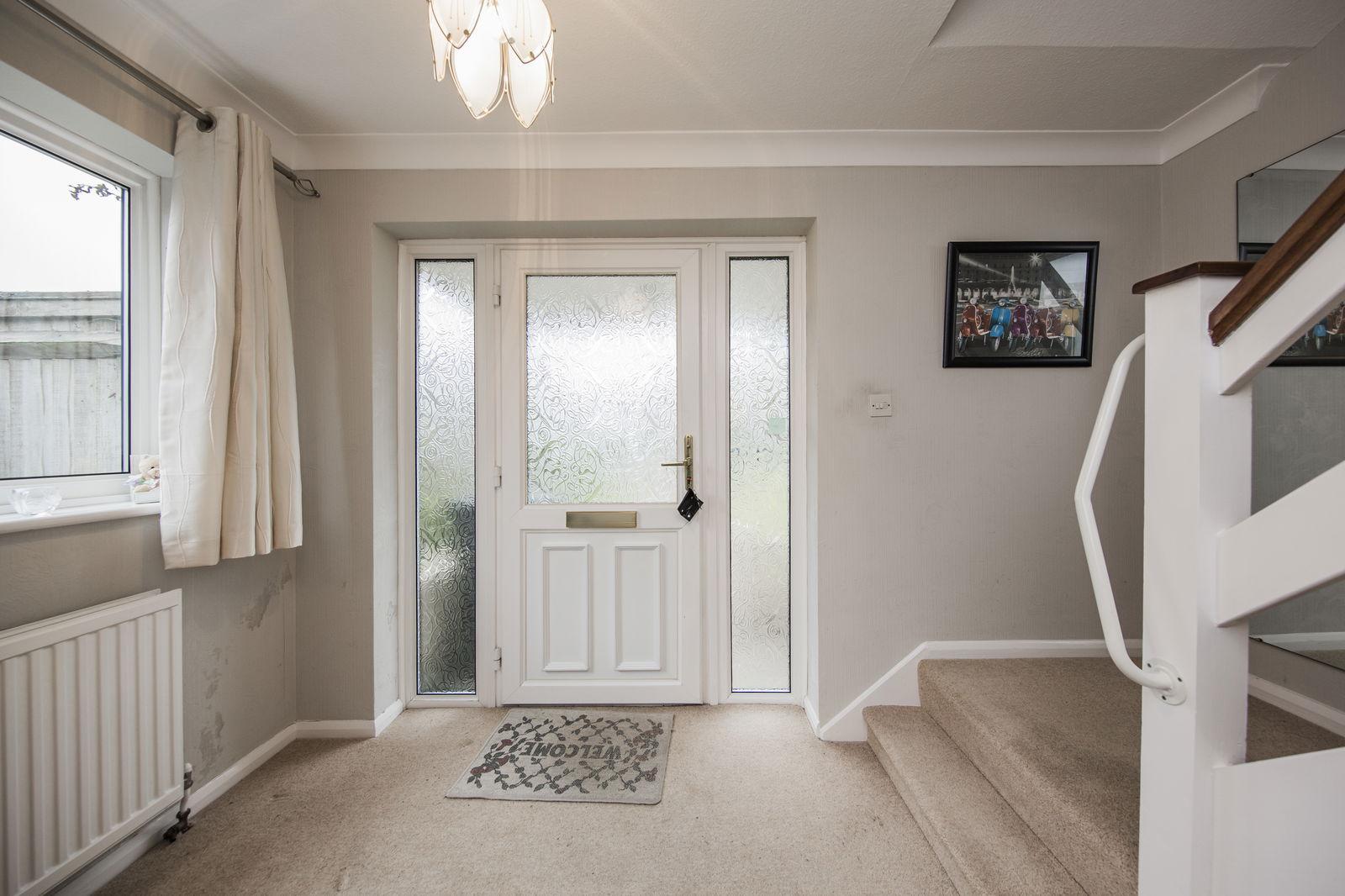 HALLWAY: Double glazed window to side, under stairs cupboard housing gas meter, carpet, radiator.