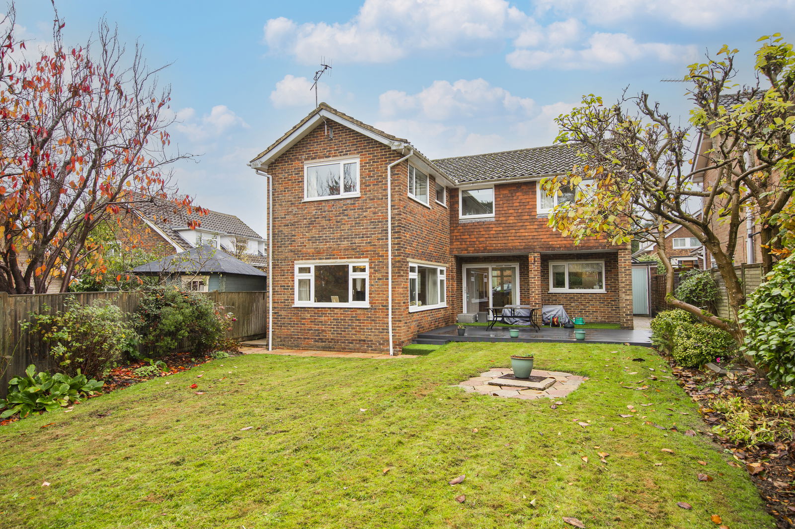 OUTSIDE REAR: A private aspect rear garden with fencing and hedges to boundary, mature trees and shrubs to borders, composite decking patio, area of lawn, gated side access.