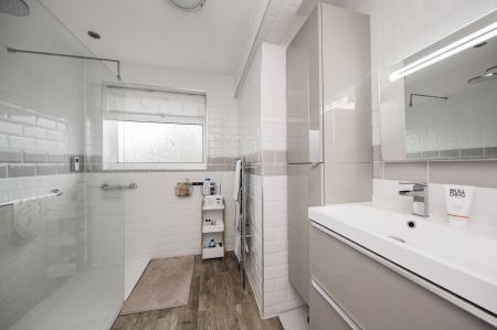 SHOWER ROOM: A large walk-in shower cubicle with electric 'Mira' shower with drench head and handheld shower attachment, large inset wash hand basin with drawers underneath and cupboard to side, tiling to walls, tiled flooring, illuminated mirror, heated towel rail. Double glazed window to side.
