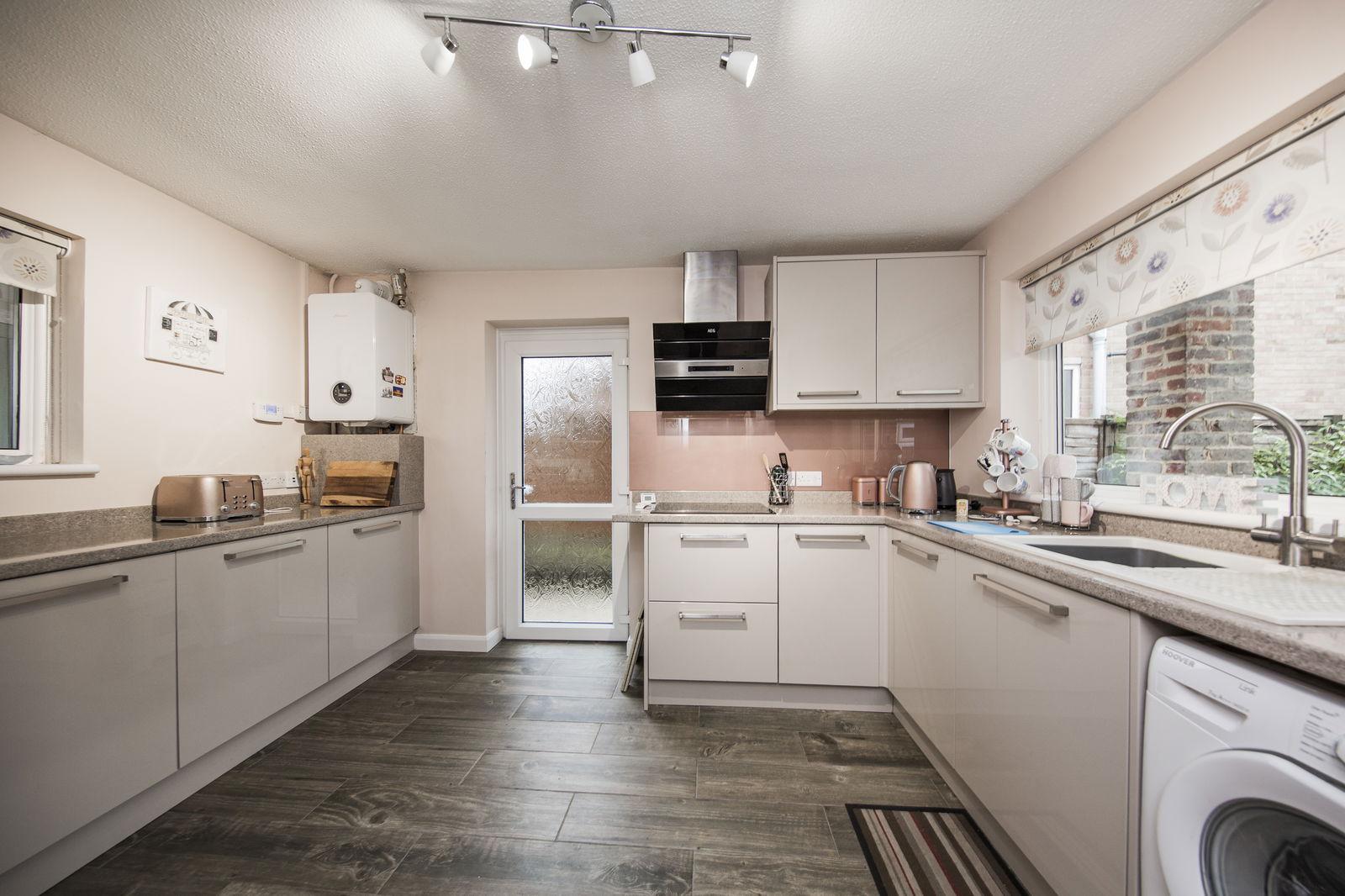 KITCHEN: A contemporary kitchen with gloss wall, base and drawer units with complementary worktop and upstand. Inset electric hob with extractor fan over and built-in double oven and microwave. Inset sink and drainer with mixer tap. Built-in slimline dishwasher, built-in fridge freezer and space for washing machine. Tiled flooring, wall mounted gas central heating boiler. Double glazed door to side and double glazed windows to front and rear.