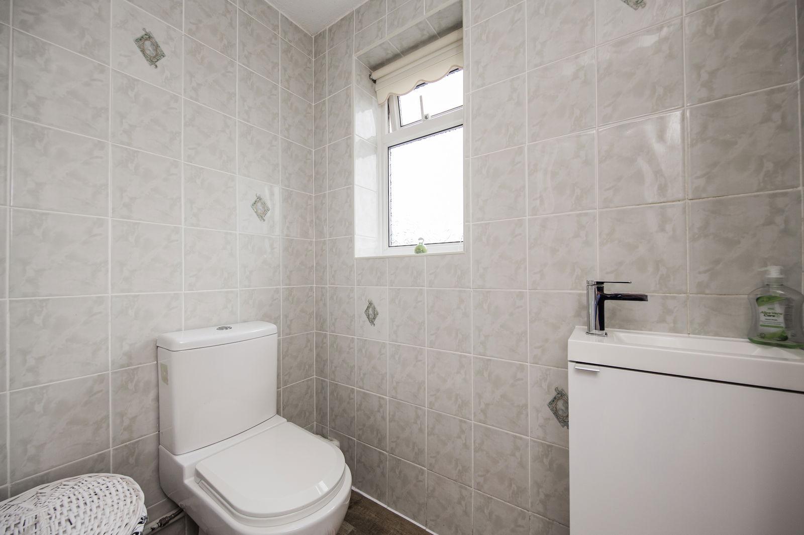 SEPARATE WC: Low level WC, wash hand basin with cupboard underneath, tiled walls and floor. Double glazed window to side.