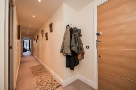 Carpeted, inset spotlights to the ceiling, wall mounted video entry phone, wall mounted thermostatic control (Agents Note: All rooms have underfloor gas heating operated by separate thermostatic controls). Large, fitted cupboard housing the hot water cylinder and hot water boiler with generous additional storage. Doors leading to:
