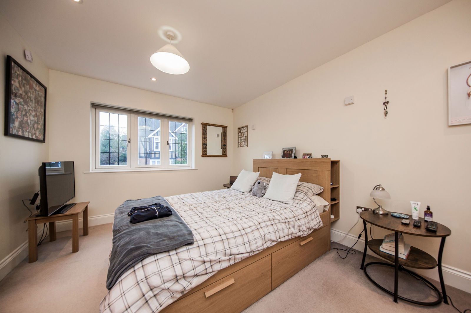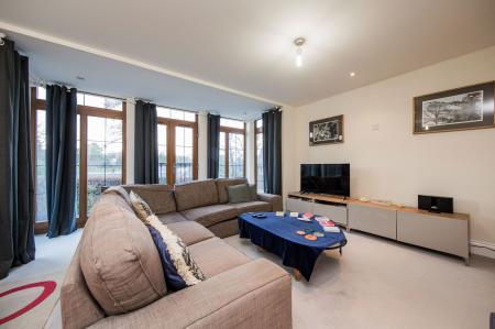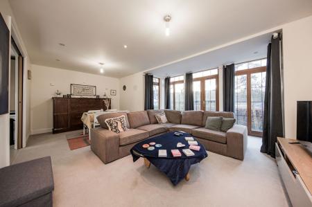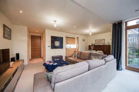 Carpeted, wall mounted thermostatic control operating underfloor heating, inset spotlights to the ceiling. A particularly good space for both lounge furniture and dining room table and chairs, various media points. A bank of Georgian style leaded windows forming a deep box bay window with further French doors and Juliet balcony, these enjoy pleasant views over the communal gardens. Double sliding doors lead to: