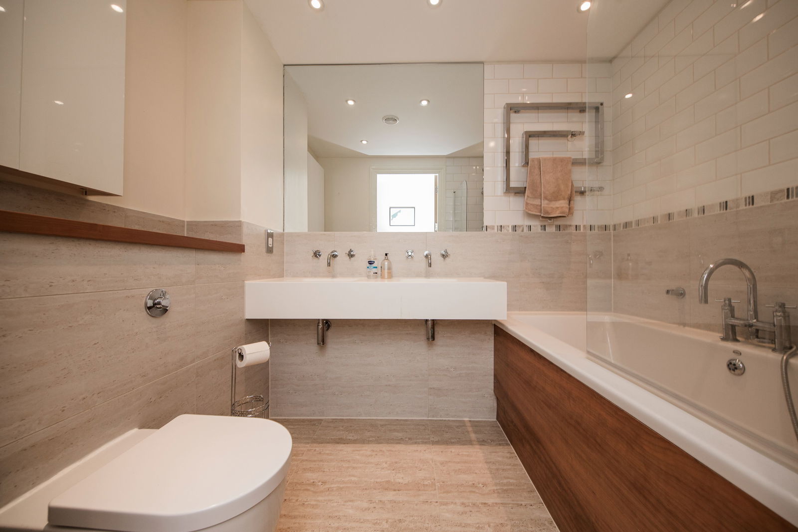 Tiled floor, low level wc, fitted wall cabinet, two wash hand basins forming part of a corian style work surface with mixer tap over, part tiled walls with a combination of metro and other stylings, electric shaver point, inset spotlights to the ceiling, extractor fan, towel radiator, panelled bath with mixer tap over, fitted glass shower screen and further twin headed shower over.