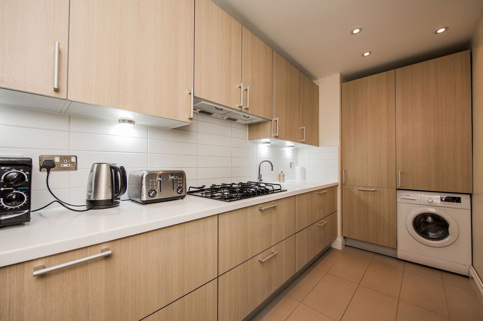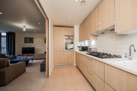 Fitted with a range of wall and base units with a complementary Corian style work surface, integrated fridge, freezer and dishwasher. Space for washing machine. Fitted double electric oven, areas of contemporary tiled splashback, inset five ring 'Bosch' gas hob with extractor hood over. Inset single bowl sink with mixer tap over. Generous storage space, tiled floor, inset spotlights to the ceiling, extractor.