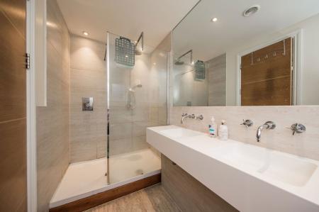 Tiled floor, large walk-in double shower cubicle with twin heads, two wash hand basins forming part of a corian style work surface with mixer tap over, wall mounted electric shaver point, low level wc, wall mounted towel radiator. Opaque double glazed windows.