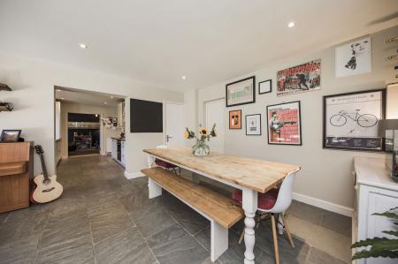 DINING/FAMILY ROOM: Bi-fold doors across the back onto the garden and double glazed window to side. Tiled floor, radiator, ceiling spotlights. Door to garage.