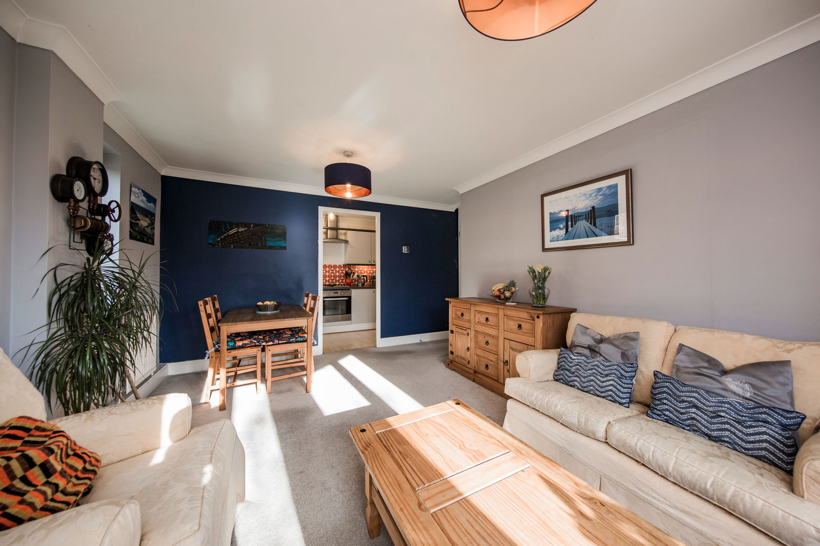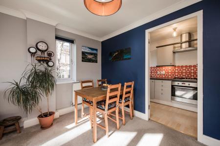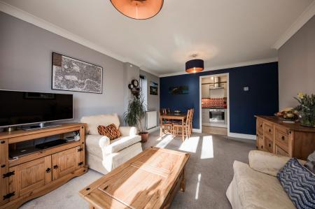 The accommodation is well laid out and benefits from good natural light throughout. The open plan living area provides clearly defined sitting and dining space, while the separate kitchen offers a practical range of units and appliance space. There are two bedrooms positioned to the rear of the building, including a double bedroom with built-in storage. The shower room has been updated with a modern walk-in shower and contemporary fittings.