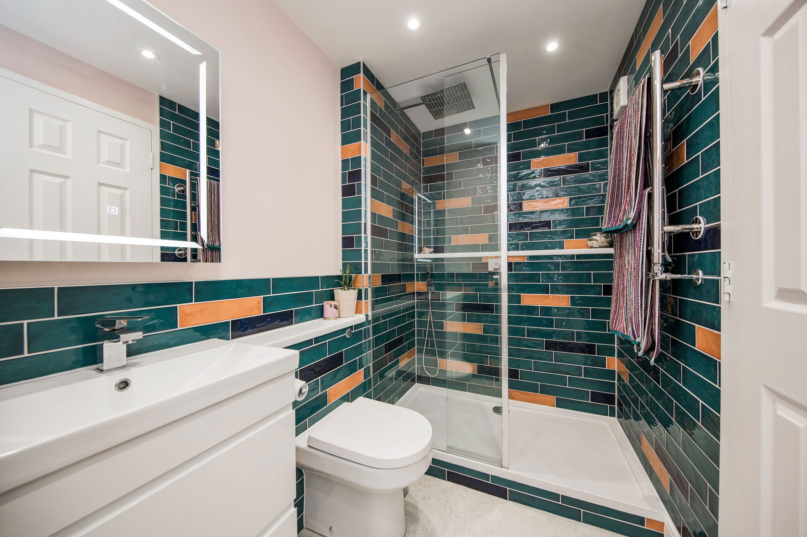 Walk-in shower with rain head, handheld attachment and wall mounted taps, tiled surround, heated chrome towel rail and storage cupboard. Low level WC, vanity united with drawers and mounted sink with mixer tap. Wall mounted LED cabinet, with shaving point and LVT flooring.