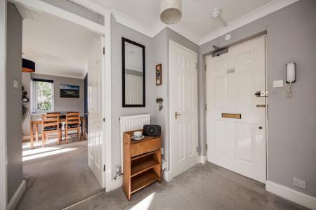 Two built in storage cupboards, one housing consumer unit, carpeted, radiator and entrance phone.