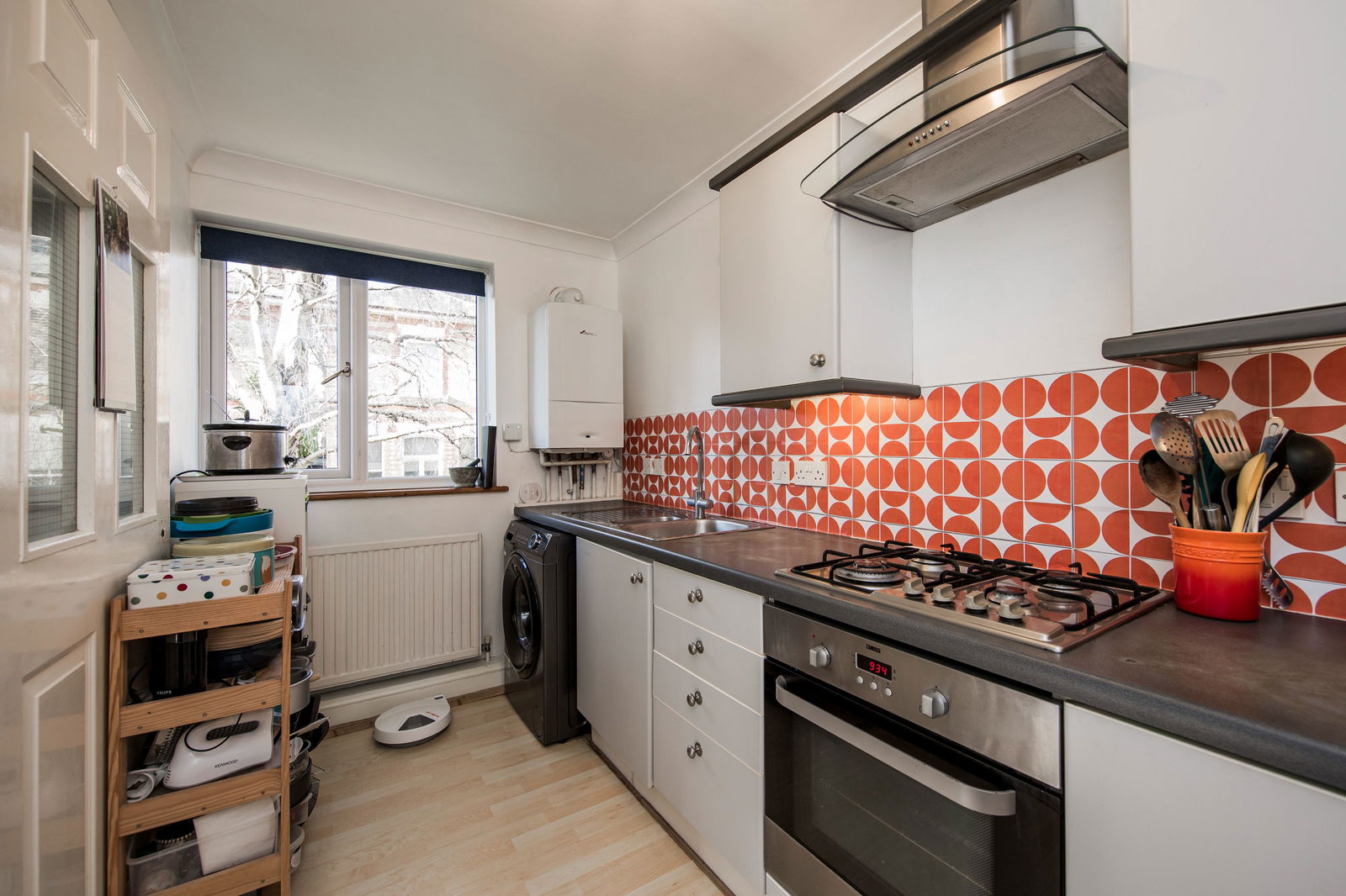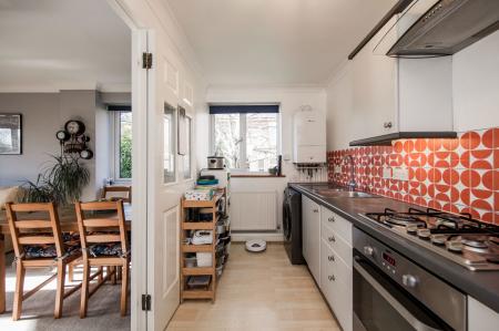 Range of wall, base and drawer units with worktop over. Inset one and a half sink with drainer and mixer tap, electric oven, gas hob with extractor over. Space for a washing machine and tall fridge/freezer. A wall mounted boiler, double glazed window to side and wood effect laminate flooring.