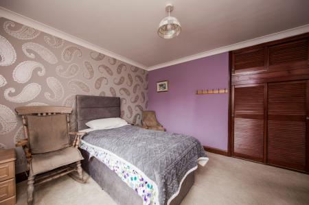 BEDROOM: Window to rear with fitted vertical blinds, single radiator, coved ceiling, built-in double wardrobes with cupboards above.