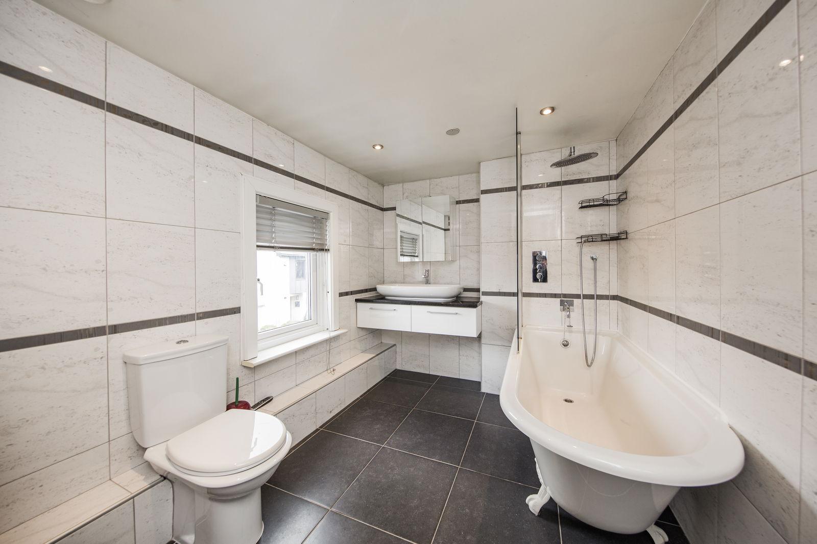 BATHROOM: Claw foot bath tub with wall mounted tap and separate thermostatic control shower over bath with waterfall head and glass screen, wash hand basin mounted on counter with drawers below and medicine cabinet, WC. Tiled walls and tiled floor with underfloor heating, heated towel rail, ceiling spotlights, ceiling speakers. Double glazed window to side.
