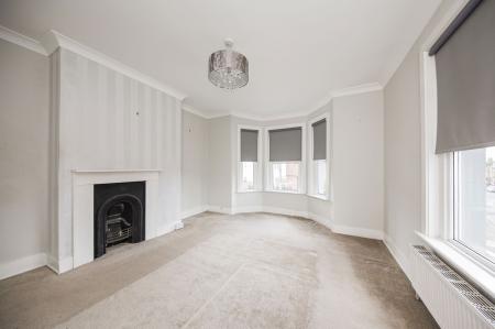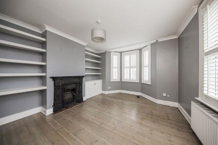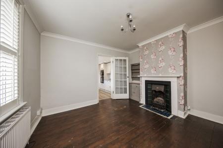 SITTING ROOM: Double glazed bay window to front and further double glazed window to front both with plantation shutters. Cast iron feature fireplace with shelving and cupboard to side, original wooden flooring, radiator.