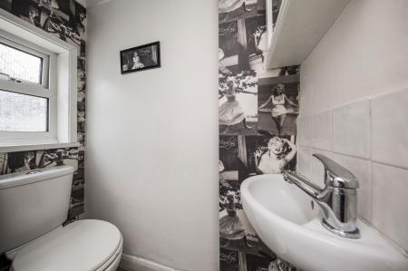 CLOAKROOM: Frosted double glazed window to rear, WC, wash hand basin, radiator.