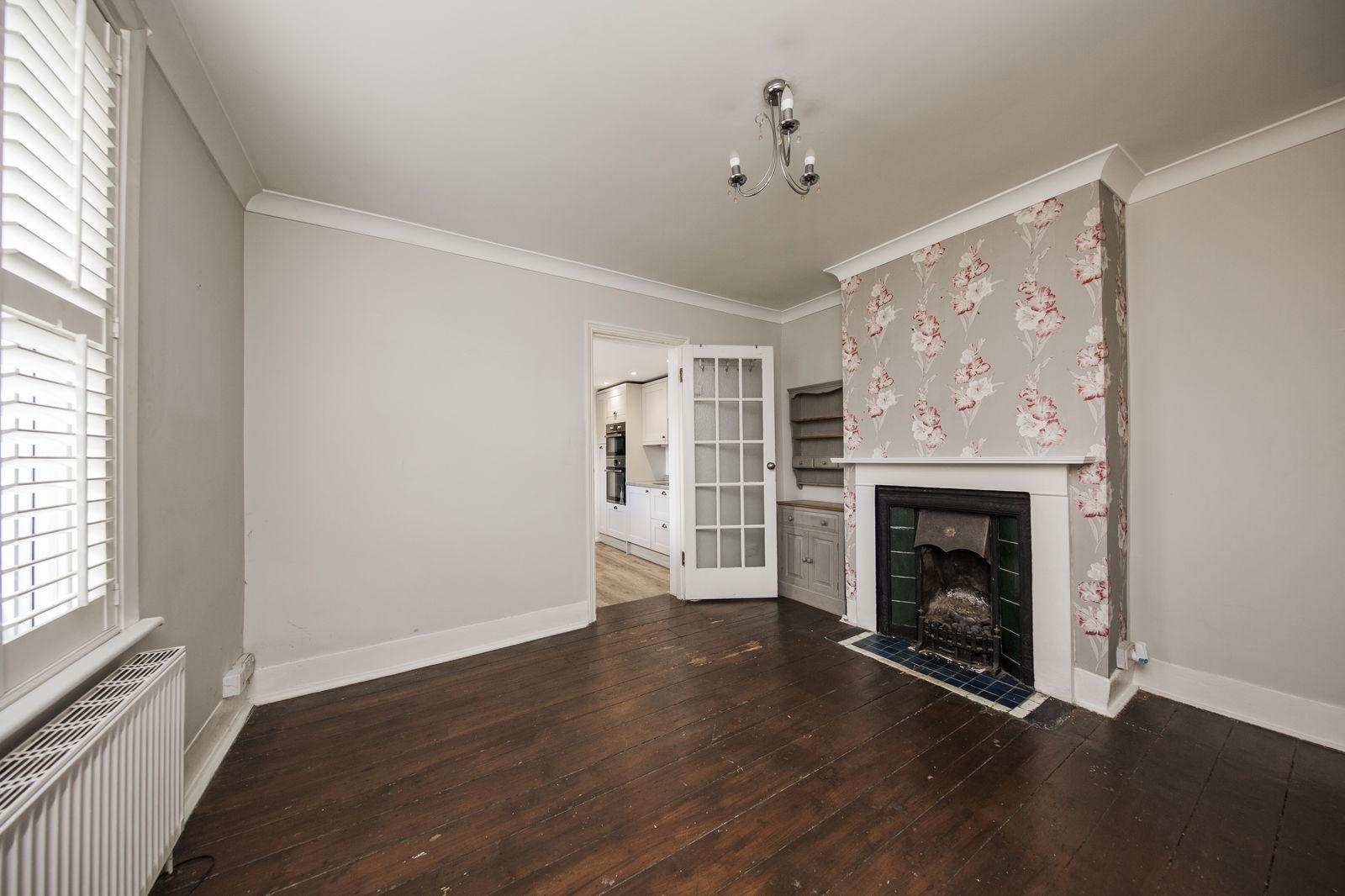 On the ground floor, the property welcomes you with a spacious and elegant living room featuring a bay window, attractive feature fireplace, and stylish wood flooring. White wooden shutters frame the windows, allowing for an abundance of natural light while offering privacy and a touch of classic charm. Adjacent to this, the dining room also benefits from wood flooring, a second period fireplace, and two under-stairs storage cupboards-creating a warm and practical space ideal for entertaining or family dining. The kitchen is well-equipped with a generous range of wall and base units and integrated appliances, flowing naturally into a useful utility area with a separate WC. From here, access is provided to the private courtyard and parking area to the side of the property.