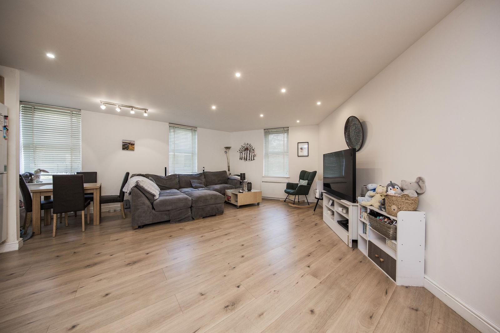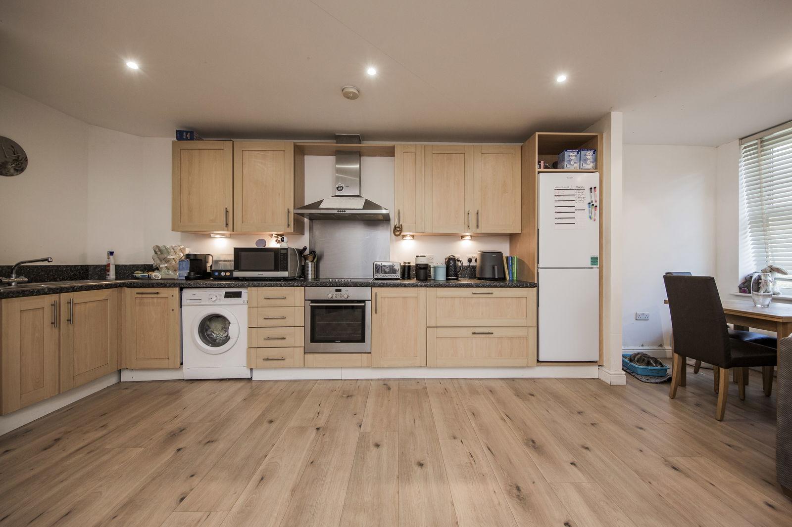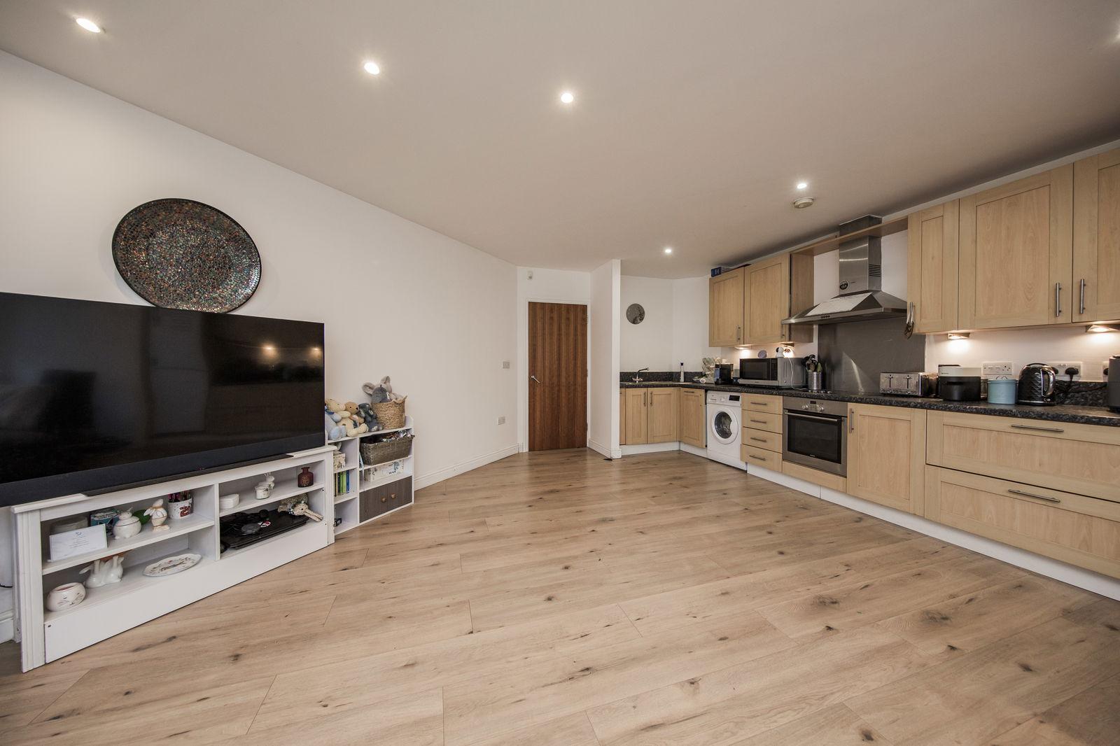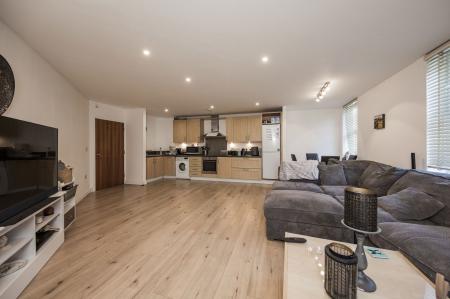 LARGE OPEN PLAN LOUNGE/DINING/KITCHEN AREA Of an excellent size and with three sets of double glazed windows each with fitted blinds affording good levels of natural light given the rooms southerly aspect. Good areas of wood effect flooring, affording excellent space for both lounge and dining furniture and entertaining. Two wall mounted electric radiators, various media points, inset spotlights to the ceiling.