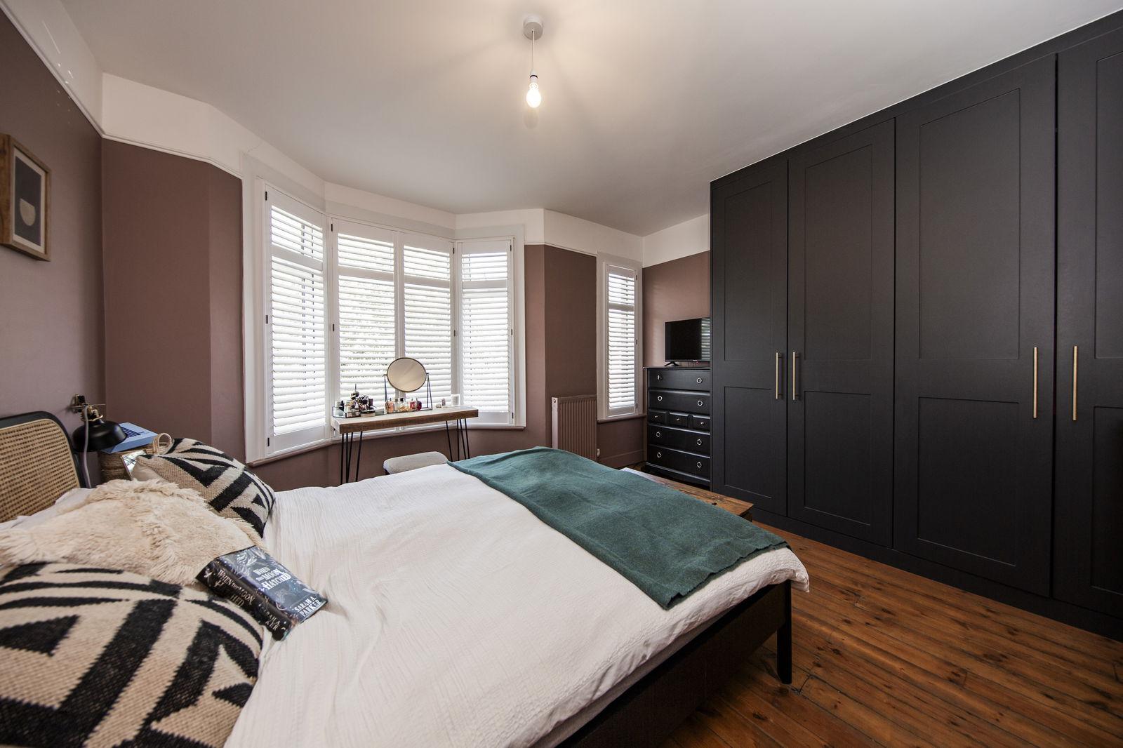 MASTER BEDROOM: Of a particularly good size and with ample room for a large bed and associated bedroom furniture, radiator, picture rail. Feature cast iron fireplace with stone hearth. Bank of floor to ceiling fitted wardrobes with areas of shelving and coat rails. Shallow bay window to the front and further double glazed window to the front both with fitted plantation shutters.