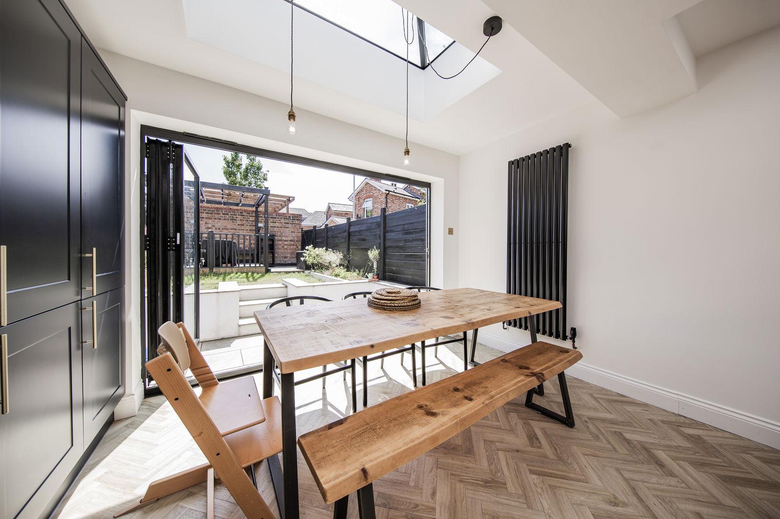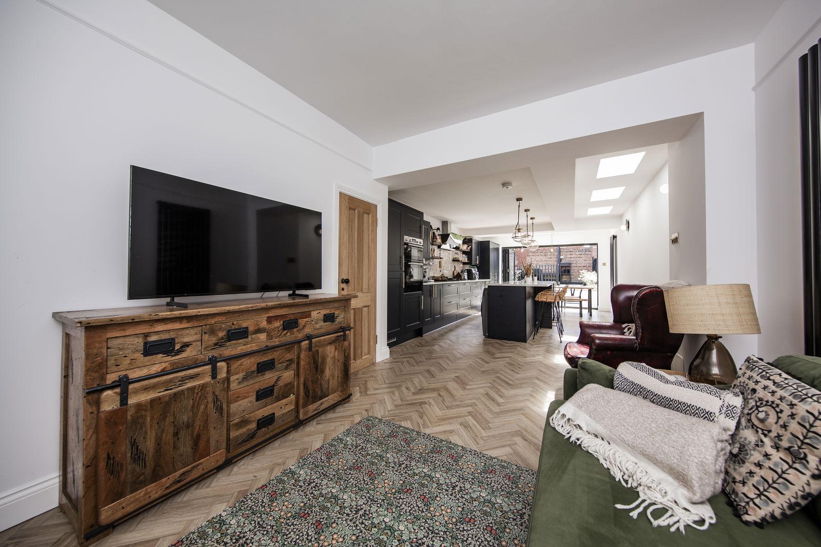 Kitchen/Dining Area: Wood effect 'Karndean' style flooring throughout and additional light levels afforded by a ceiling lantern. Good space for a large dining table and chairs. Feature radiator. Bi-fold double glazed doors to the rear gardens. Fitted with an attractive contemporary styled kitchen with a complementary quartz work surface and further island. The island has a breakfast bar area with seating for two people and good general storage space. One and a half bowl Butler sink with mixer tap over. Integrated dishwasher, fridge and freezer. Space for a washing machine and tumble dryer. Integrated double 'Bosch' electric oven and inset five ring 'Bosch' gas hob with 'Bosch' extractor system over. Feature artisan styled part tiled wall, areas of exposed shelving.