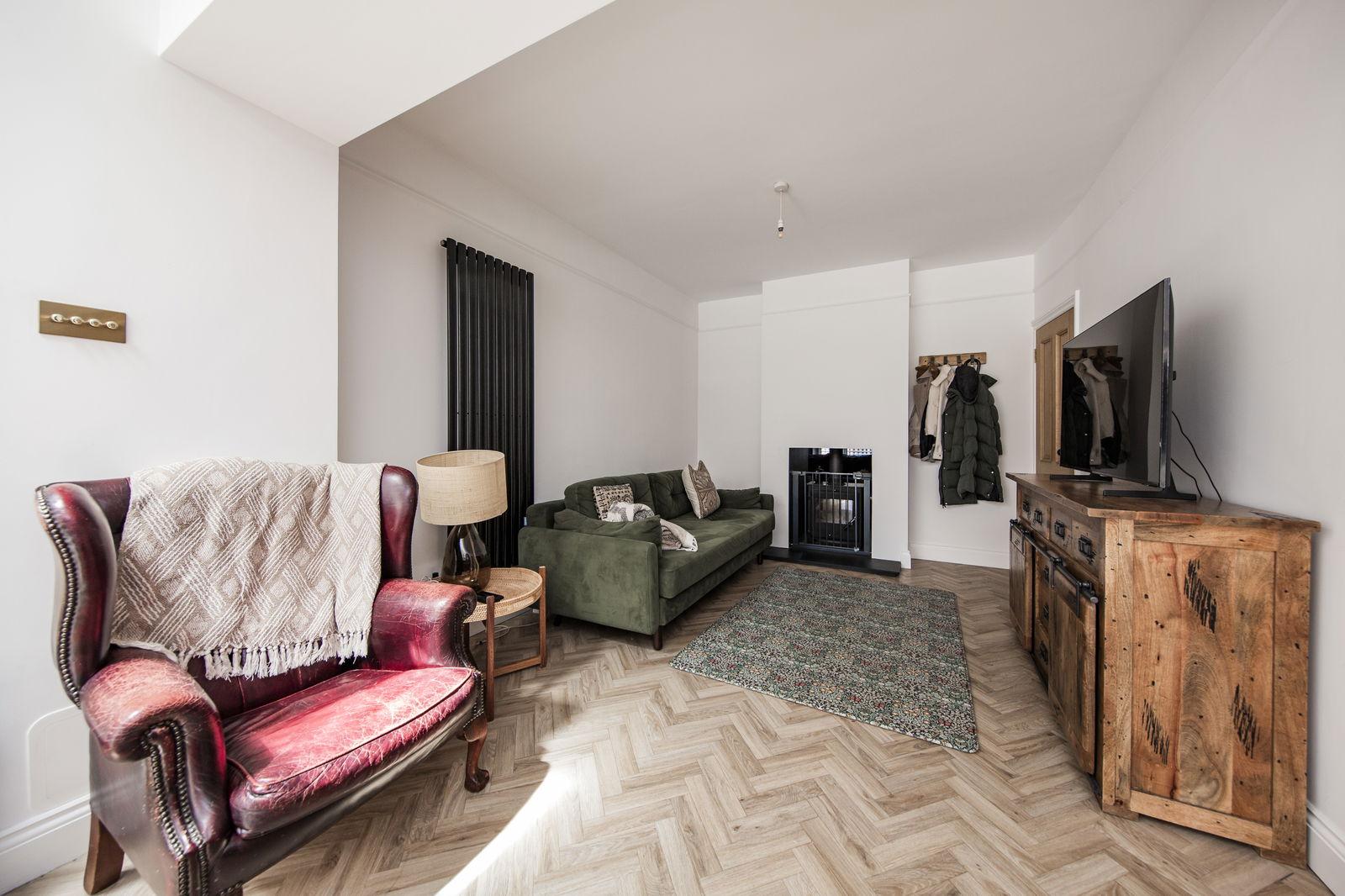 Lounge Area: Wood effect 'Karndean' style flooring, feature radiator, picture rail. Space for lounge furniture. Feature recess (formerly fireplace) with inset dual aspect wood burner. Door to a cloakroom. This is immediately open to: