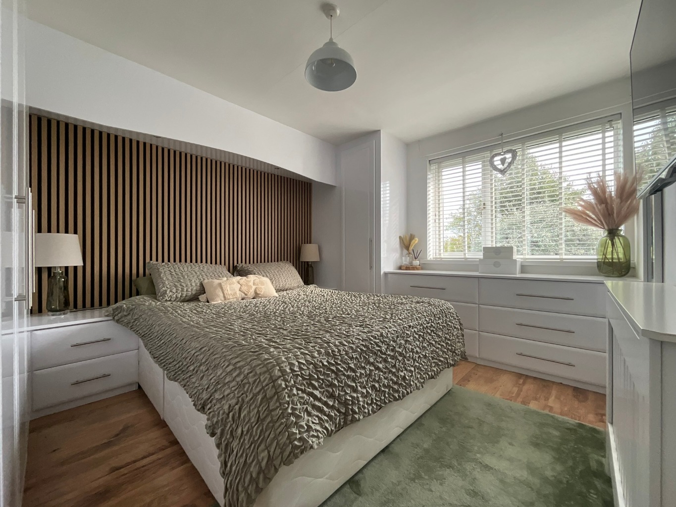 Master Bedroom (3.52m x 3.14m)With UPVC double glazed window, laminate wood flooring, radiator, fitted wardrobes, over bed storage and drawers.
