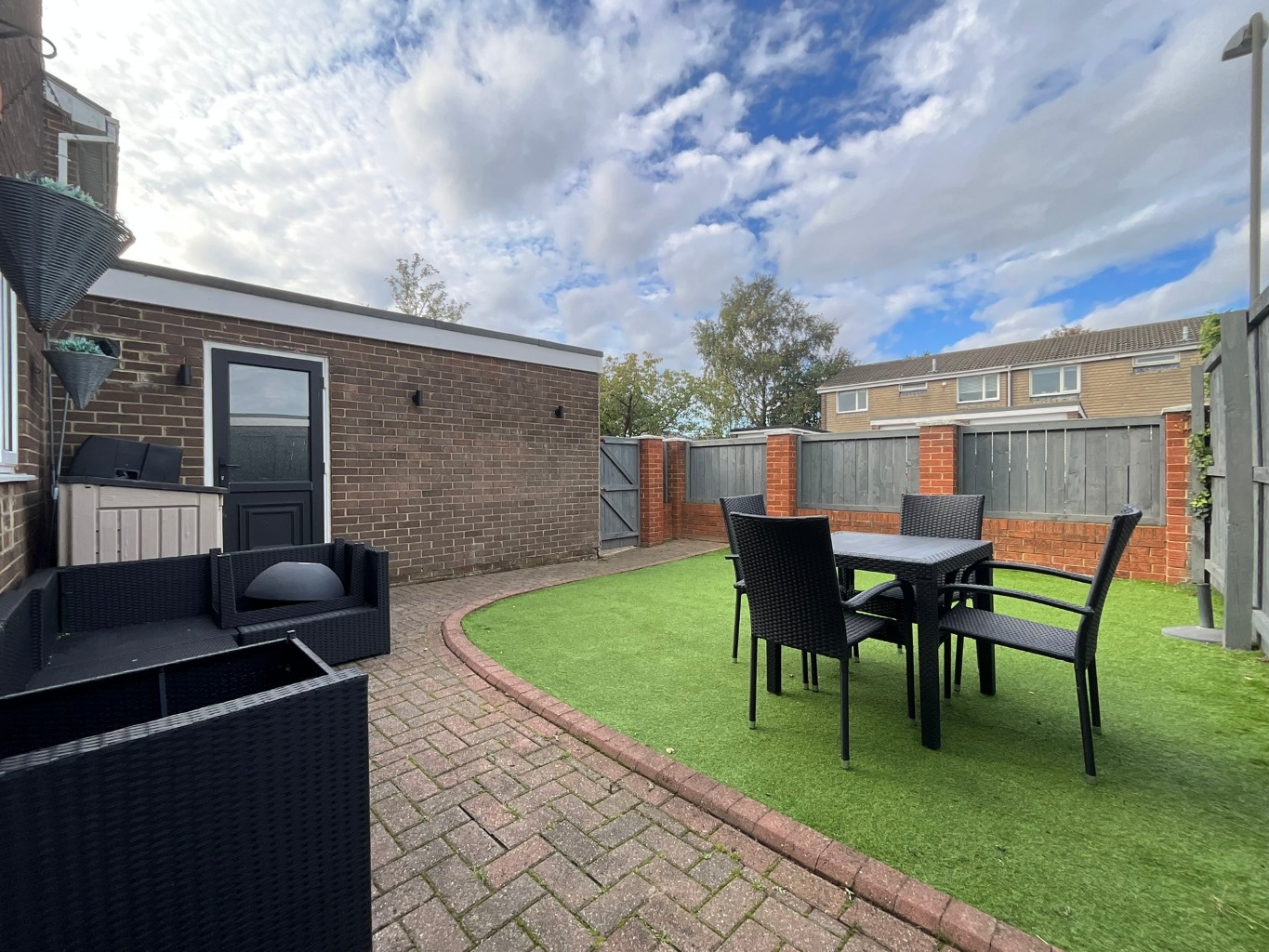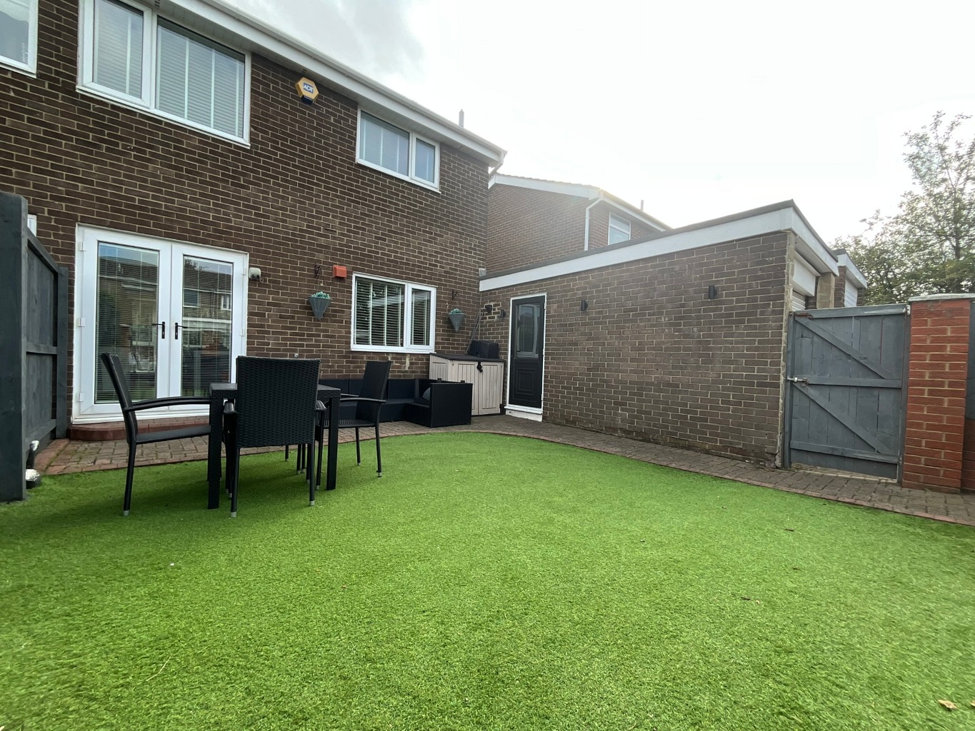 Rear ExternalLawned garden, block paved patio, garage, driveway.