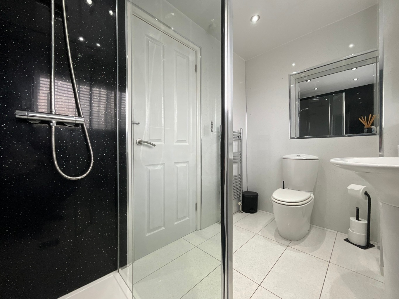Bathroom (1.53m x 2.48m)White three piece suite with low level WC, pedestal hand wash basin with mixer tap, stand in double shower with overhead mixer shower, waterfall shower head, glass shower screen, tiled floor, chrome heated towel rail, and spotlights to ceiling.