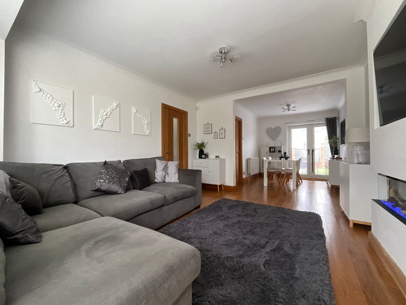 Lounge (3.38m x 3.48m)With UPVC double glazed window, coving to ceiling, solid wood flooring, radiator, open to dining room and media wall.