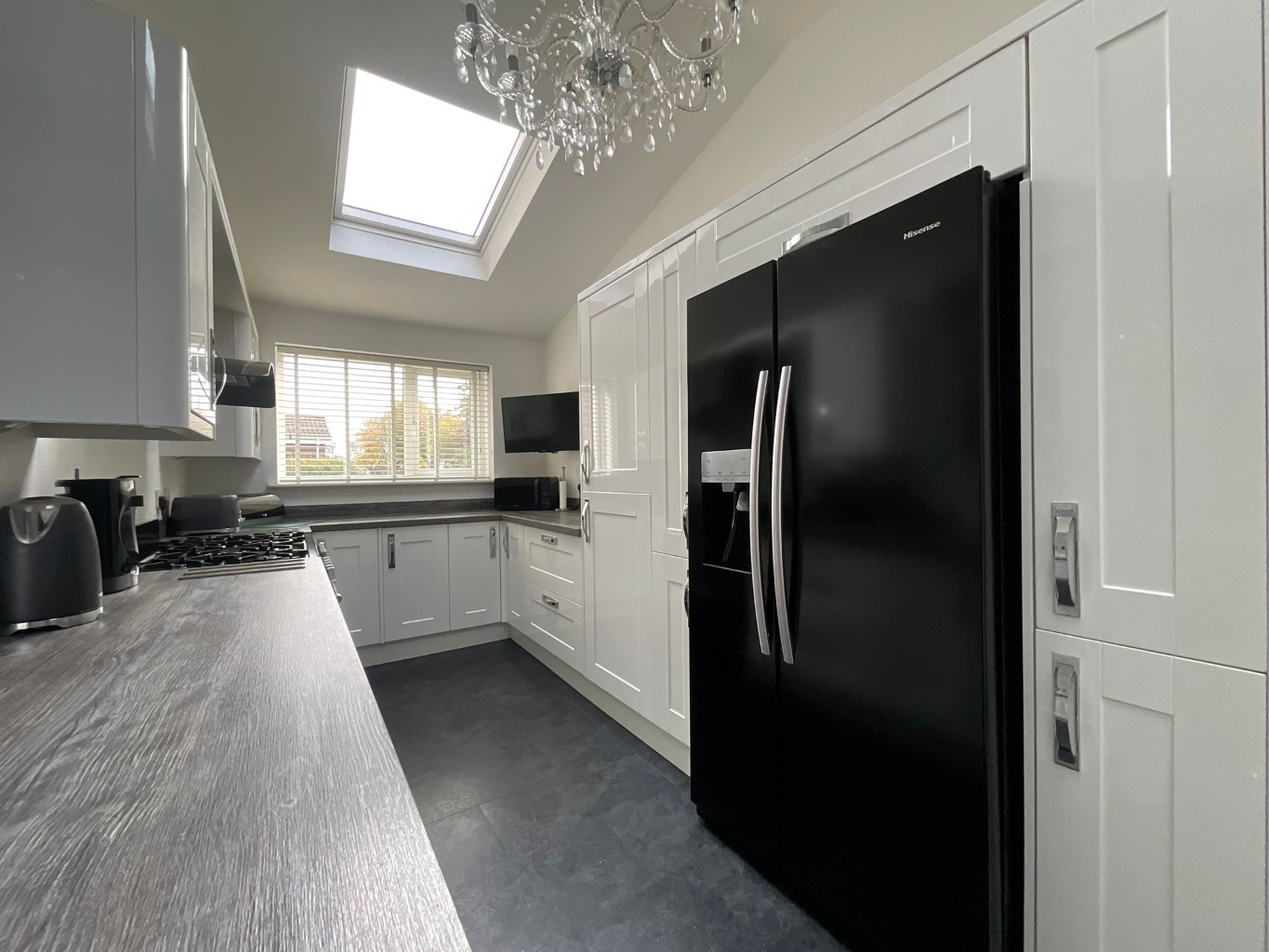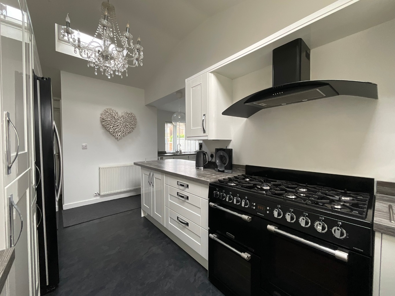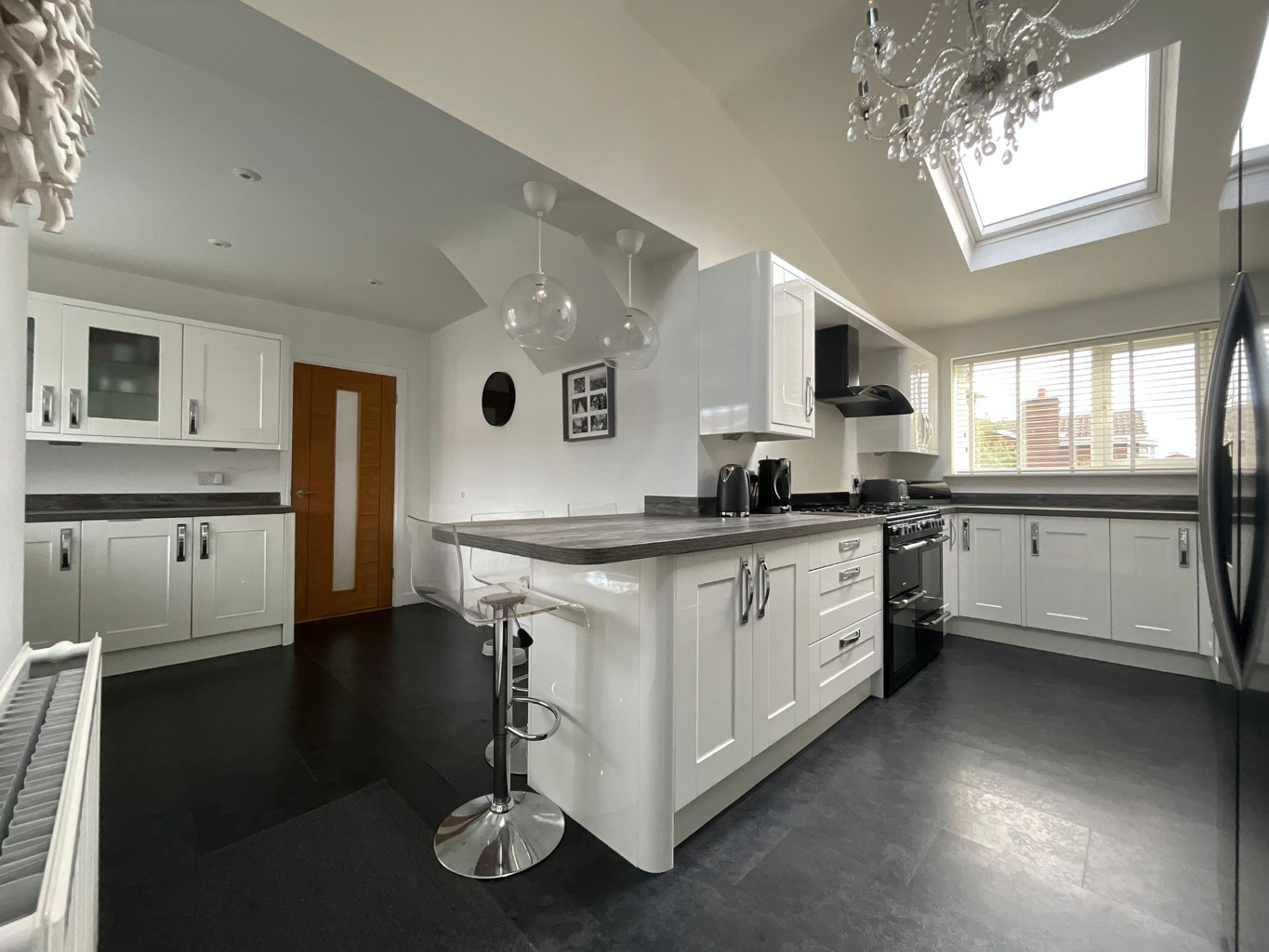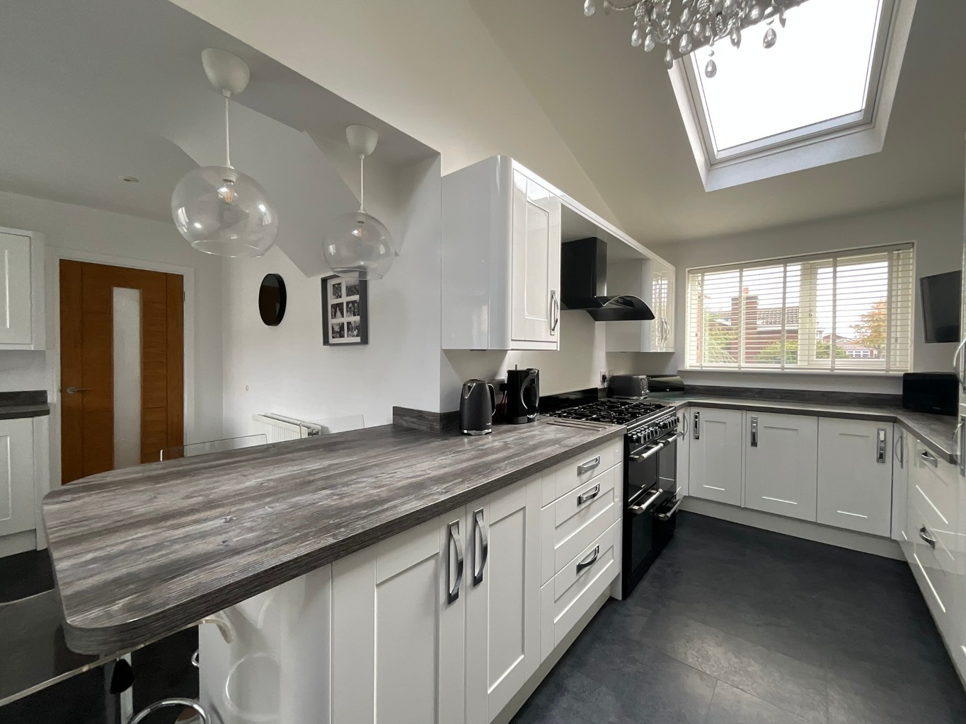 Kitchen (4.93m x 5.38m)With a range of wall and floor units, sink with mixer tap and drainer, integrated dishwasher, 7 burner range double oven, chimney hood, breakfast bar, splash back tiles, UPVC double glazed window, spotlights to ceiling, tiled floor, integrated fridge, two radiators and UPVC double glazed window.
