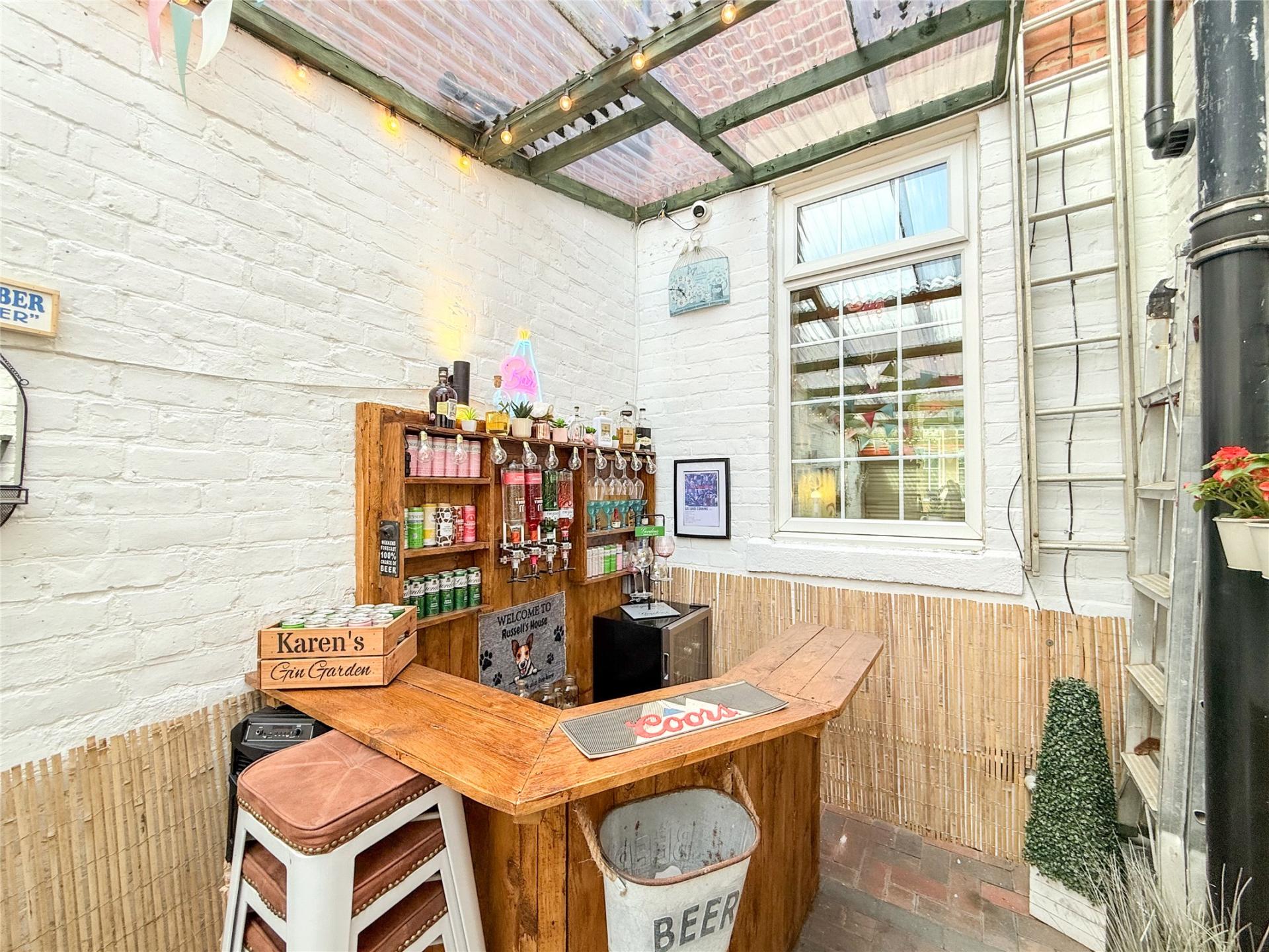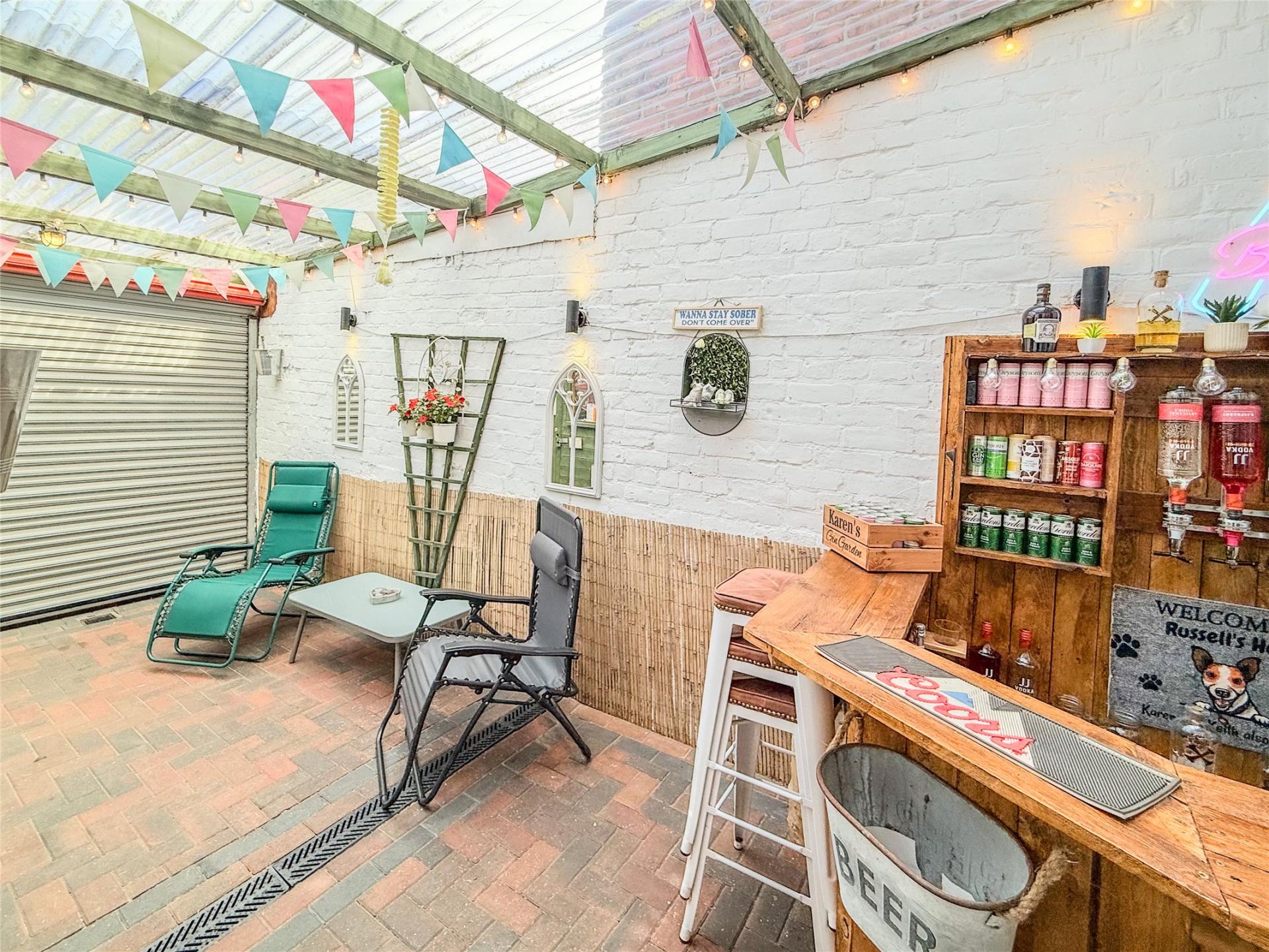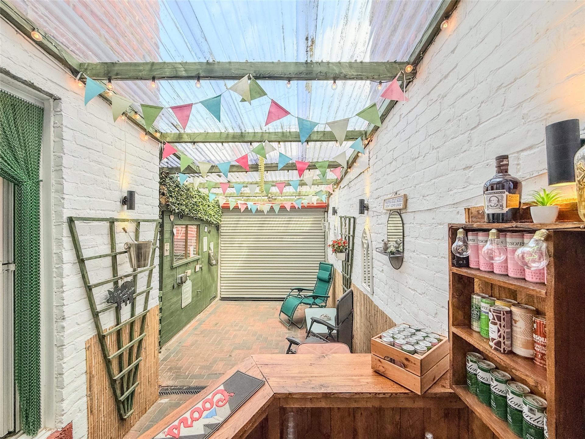 Externally, the property continues to impress. To the front, a well-tended enclosed garden features a neatly kept lawn and space for outdoor seating. To the rear, a block-paved courtyard offers a superb entertaining area which is covered and incorporates a built-in bar. A garage door to the rear provides the option for secure off-street parking, enhancing the practicality of this charming home.