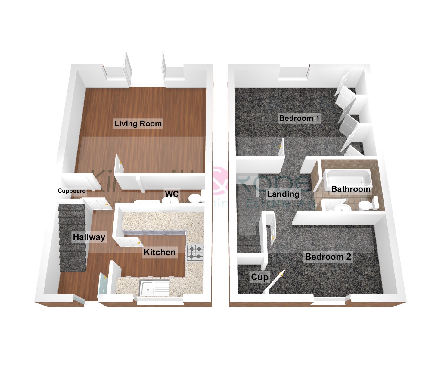 Ascending to the first floor, the property features two well-proportioned bedrooms with fitted wardrobes to the master. Each bedroom is designed to maximise natural light and provides a peaceful retreat. The main bathroom, serving both bedrooms, is finished to a good standard, typically comprising a bath with overhead shower, wash basin, and WC, catering to all family needs.