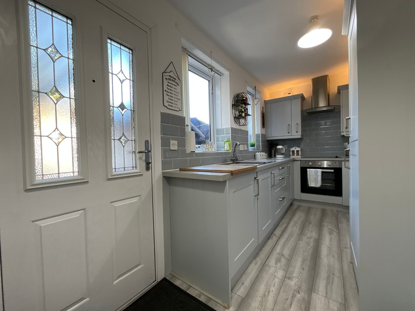 Kitchen (5.00 x 1.88)Features: UPVC double glazed window x 2, radiator, range of wall and floor units, contrasting work surfaces, oven, hob, extractor hood, integrated fridge/freezer, plumbing for washing machine, sink with mixer tap and drainer, composite door to rear.
