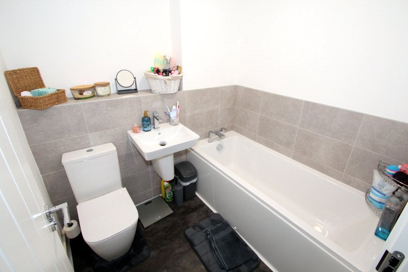 Family Bathroom/WC Modern white low level WC, wall hung wash hand basin, panelled bath, chrome fittings, half height splash tiling to two walls, extractor fan and radiator.
