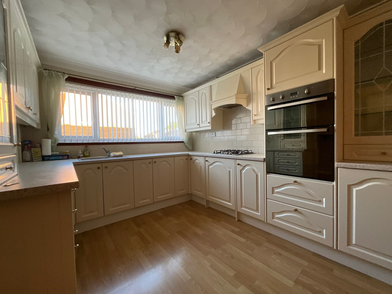 Kitchen (4.98 x 4.90)Features: stairs to first floor, storage cupboard, UPVC double glazed window, range of wall and floor units, oven, hob, extractor hood, integrated fridge/freezer, plumbing for washing machine, sink with mixer tap and drainer, splash back tiles.