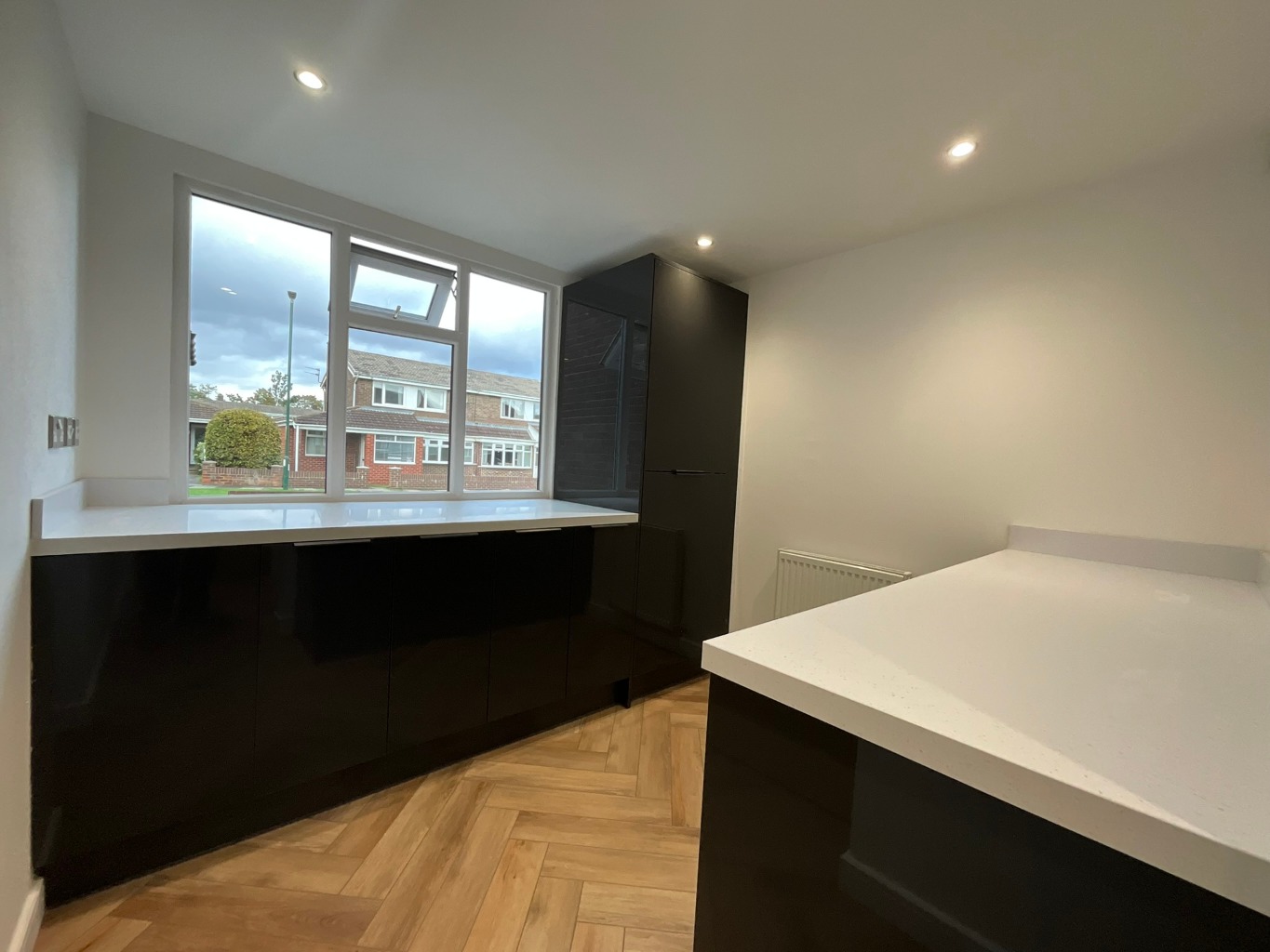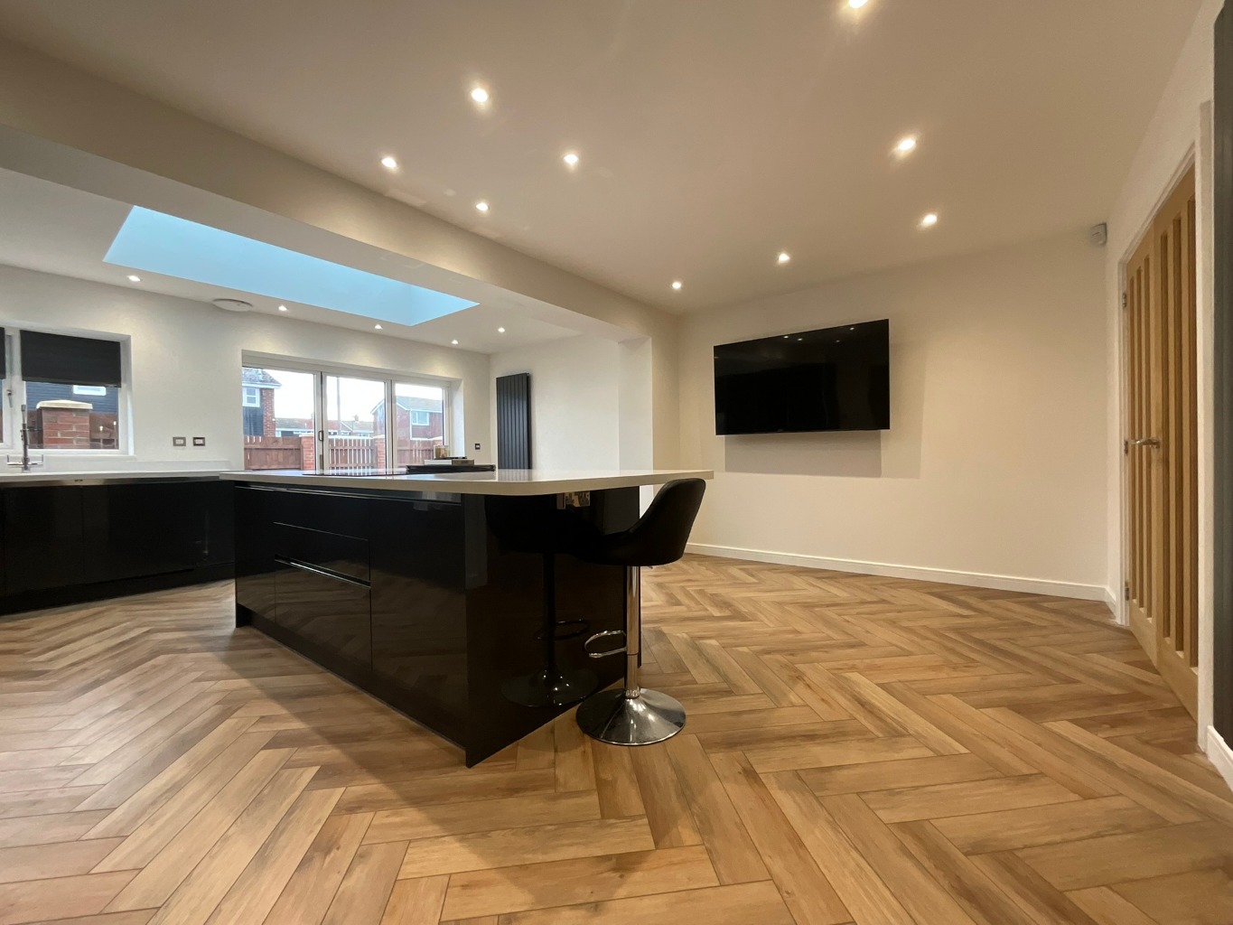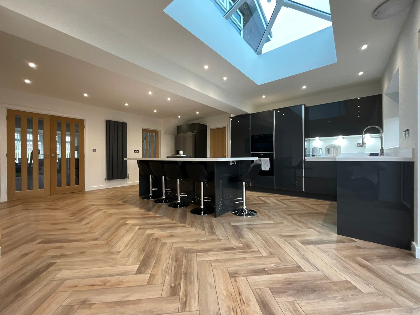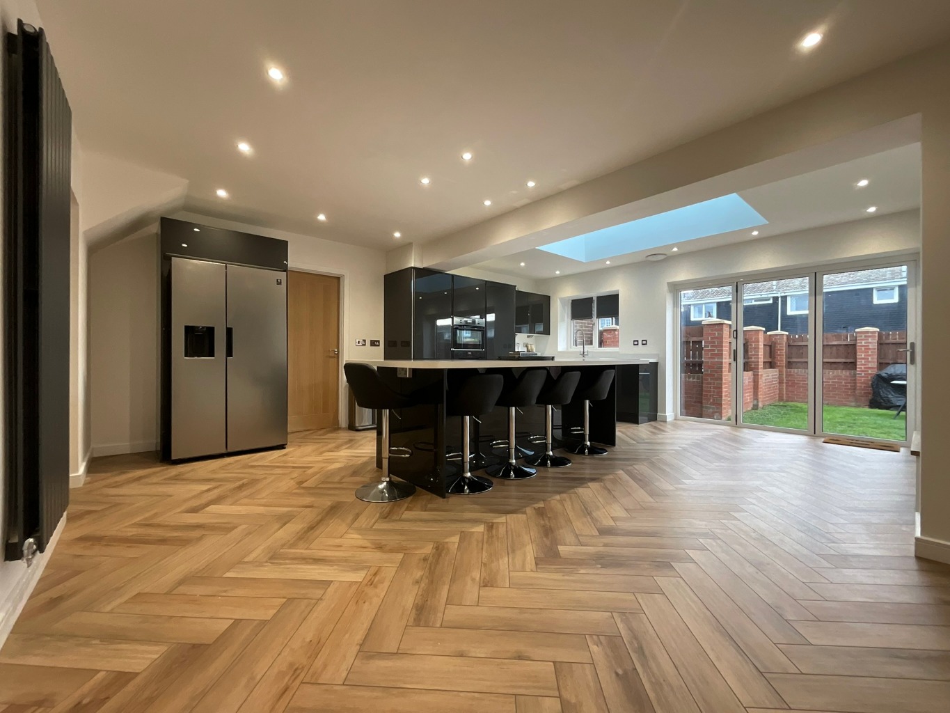 Kitchen (6.16 x 5.46)Features: UPVC double glazed window, range of wall and floor units, contrasting work surfaces, oven, hob, extractor hood, sink with mixer tap and drainer, LVT wood flooring, breakfast bar, island, spotlights to ceiling, vertical radiator x 2, bi-fold doors to rear.