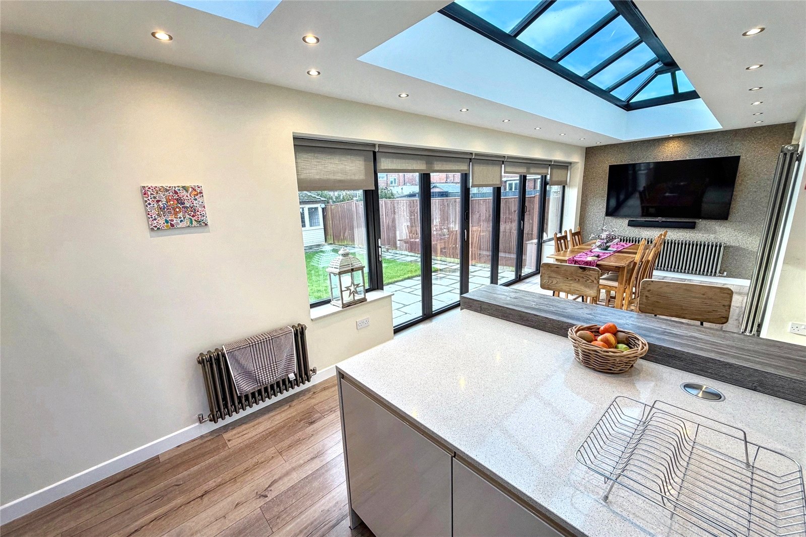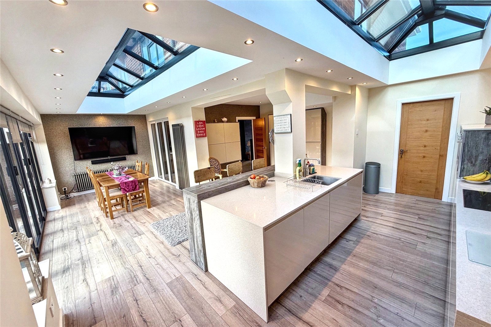 Extended Kitchen & Orangery 27'6" x 18'8" (8.38m x 5.7m). The wrap around extension provides a stunning space with two glass atriums. The kitchen area is finished with modern wall and base units, two integrated electric ovens and microwave, integrated electric hob and extractor fan, integrated dishwasher, sink unit and breakfast bar, two old school radiators. There is living and dining space and bi-fold doors to the rear of the extension. Door leading to the garage.
