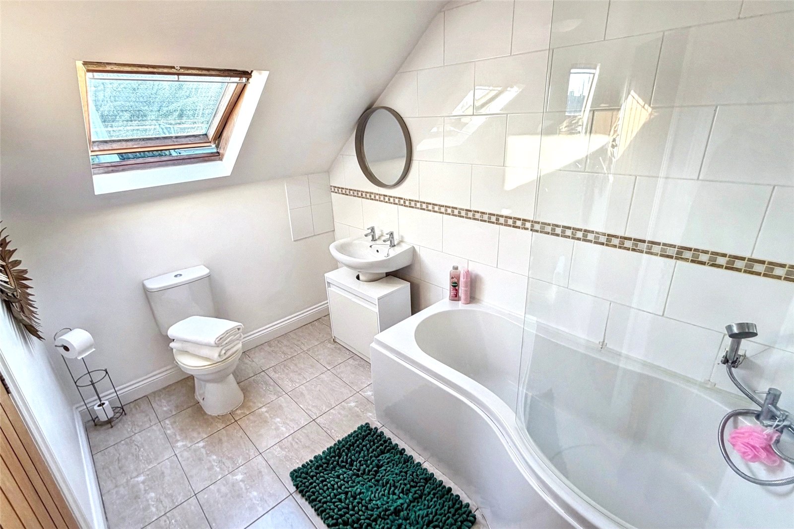 Bathroom/WC 10' x 6'7" (3.05m x 2m). Fitted with a white suite comprising; panelled shower bath with shower above, low level WC and wash basin, part tiled walls and tiled floor, radiator and double glazed Velux window to the front. Door to bedroom three.