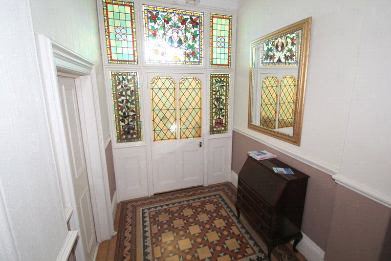 Inner Hallway Beautiful mosaic style flooring, feature original coloured stained glass windows, stairs off.