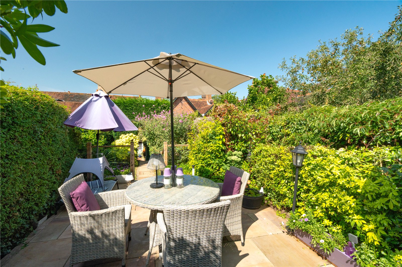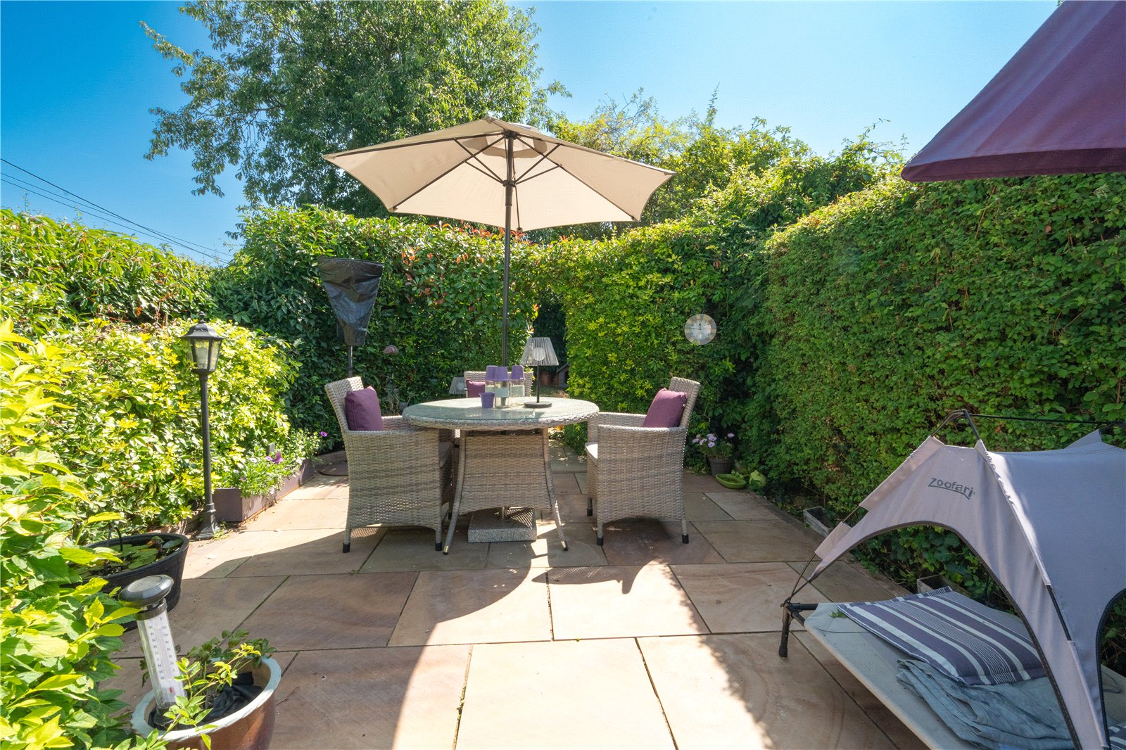 Beyond, a beautifully landscaped patio area provides an ideal spot for outdoor dining and entertaining, complete with ample space for a table and chairs under the shade of a parasol. Mature hedging and established planting enclose the space, offering privacy and a sense of tranquillity.