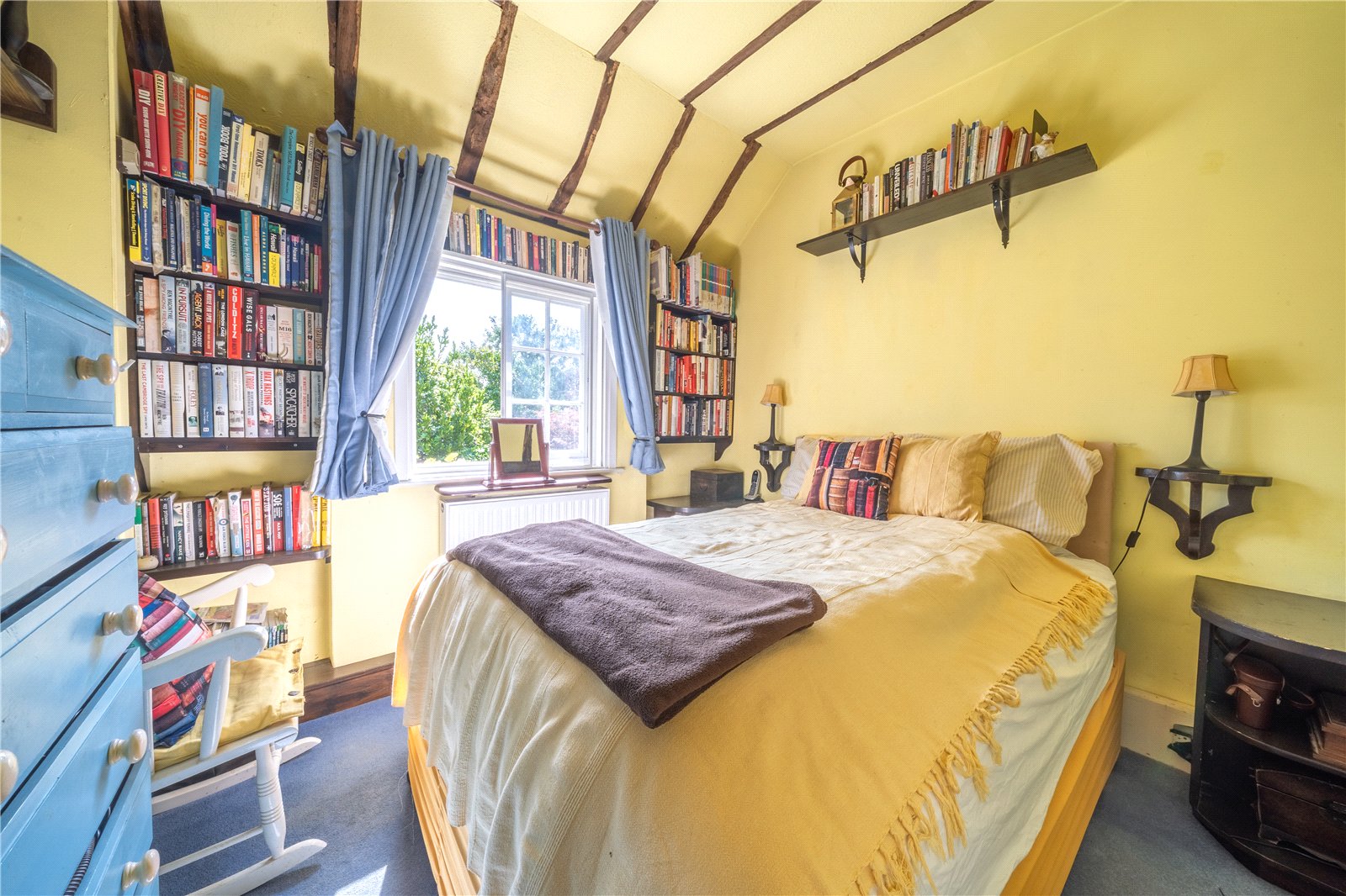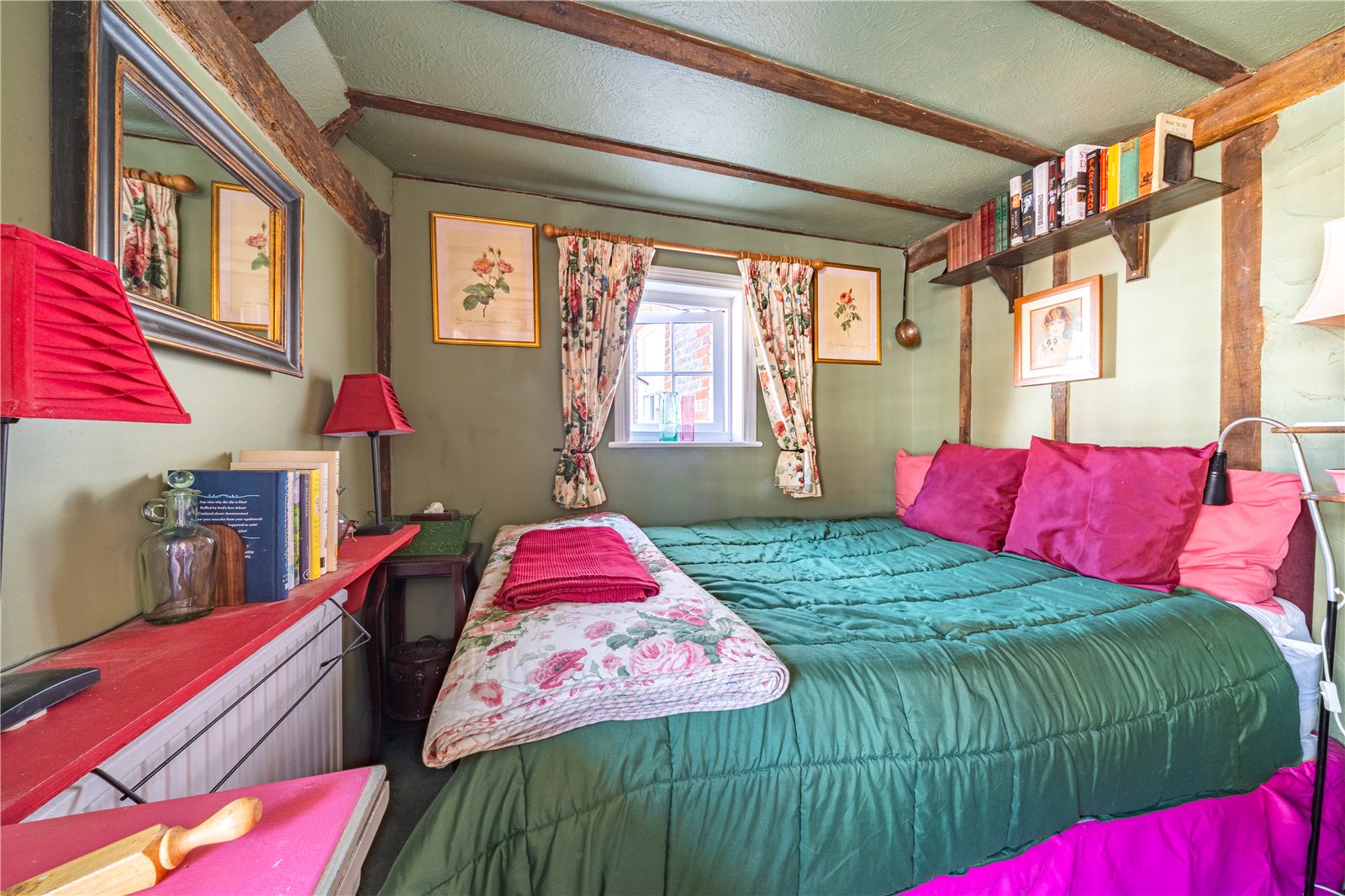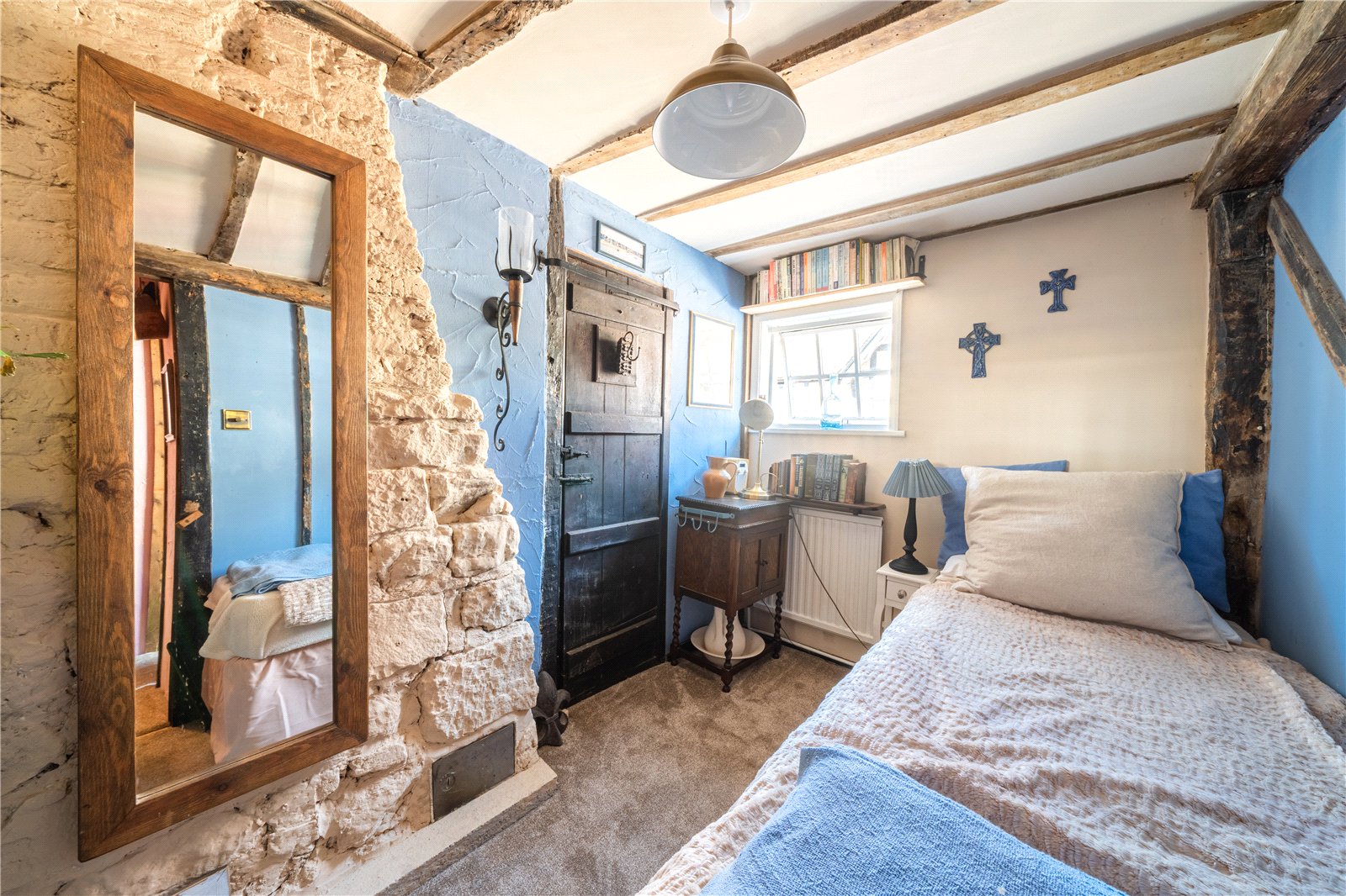 BEDROOM 2: A charming and characterful bedroom with exposed timber beams and a cottage-style latch door, creating a warm and traditional atmosphere. The room benefits from a window overlooking the front aspect, allowing natural light to flow in and enhancing the cosy setting. With thoughtful use of space, including shelving and alcoves, this room is ideally suited as a comfortable bedroom, guest room, or even a study.