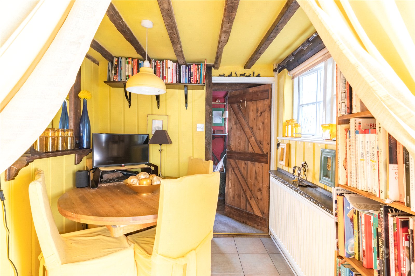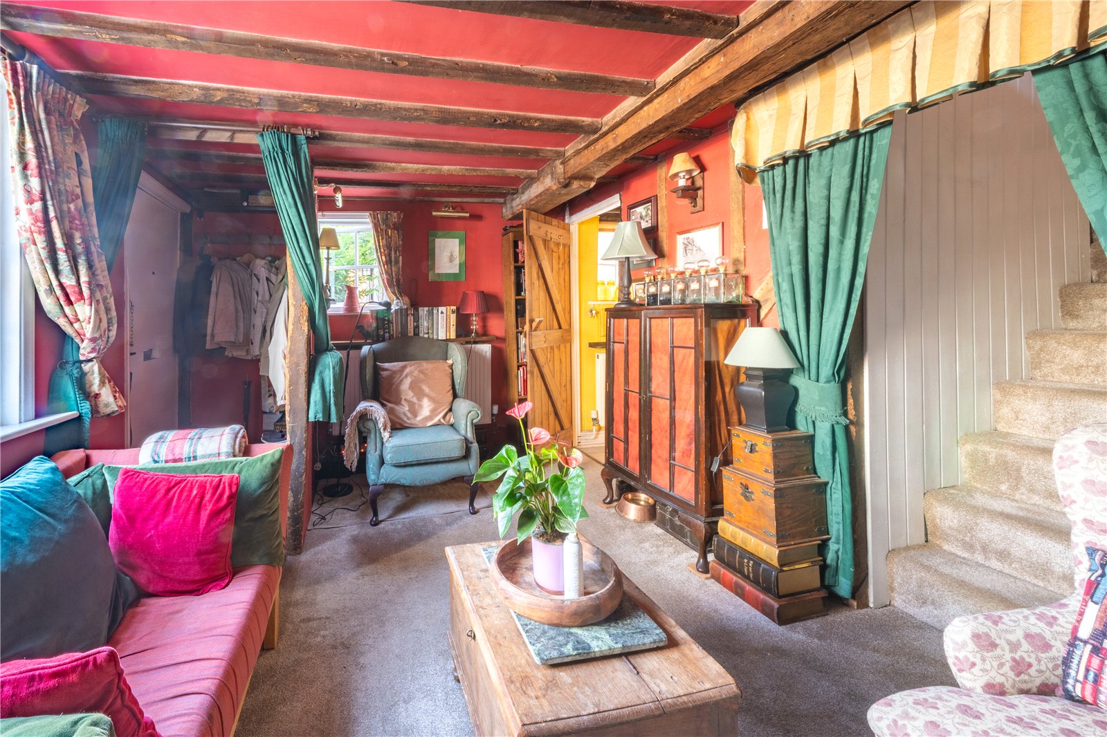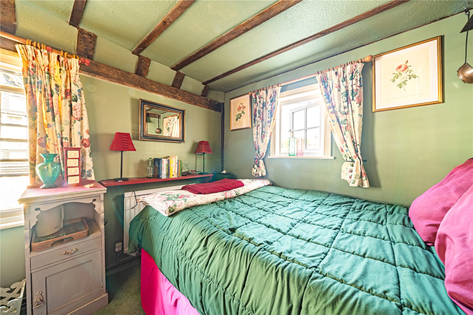 BEDROOM 2: A charming and characterful bedroom with exposed timber beams and a cottage-style latch door, creating a warm and traditional atmosphere. The room benefits from a window overlooking the front aspect, allowing natural light to flow in and enhancing the cosy setting. With thoughtful use of space, including shelving and alcoves, this room is ideally suited as a comfortable bedroom, guest room, or even a study.