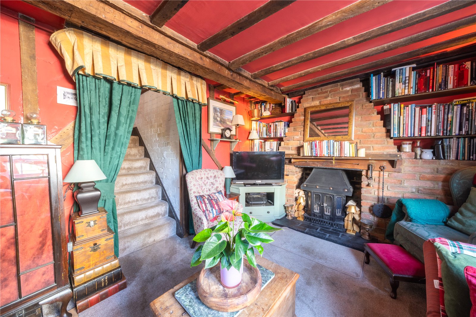 LIVING ROOM: A wonderfully inviting and characterful reception room, rich in period charm with exposed timber beams and a feature brick fireplace providing a cosy focal point. The room is bathed in natural light from a large sash window to the front, creating a warm and welcoming atmosphere. Thoughtfully arranged with built-in shelving and alcove storage, it offers both practicality and style, while the generous proportions provide ample space for comfortable seating. A perfect setting for relaxing with family or entertaining guests.