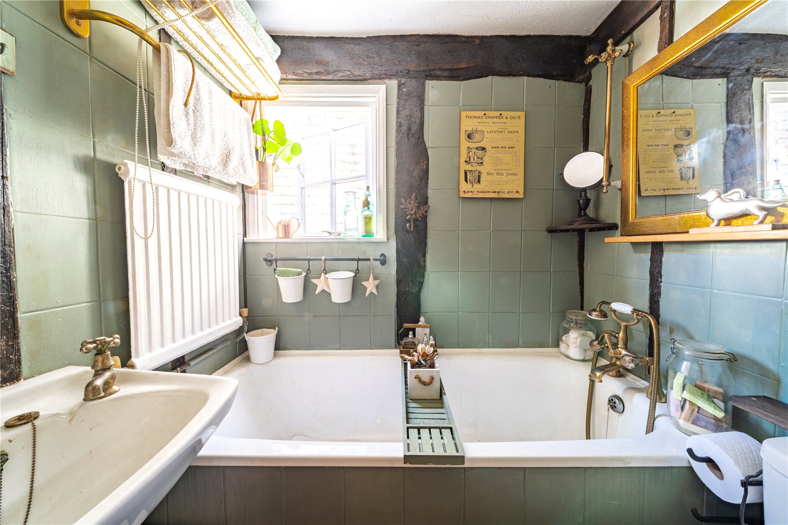 FAMILY BATHROOM: A stylishly presented family bathroom combining period character with modern comfort. The space features exposed timbers set against tiled walls, complementing a fitted bath with shower attachment. A sash window provides natural light and ventilation, while the thoughtful layout includes a pedestal wash basin and WC. Finished with practical shelving and tasteful detailing, this bathroom is both charming and functional, serving the household with ease.