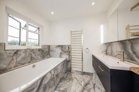 FAMILY BATHROOM: Bath with handheld shower, twin sinks housed in vanity units and mirrored cabinets above, towel rail and window to front.