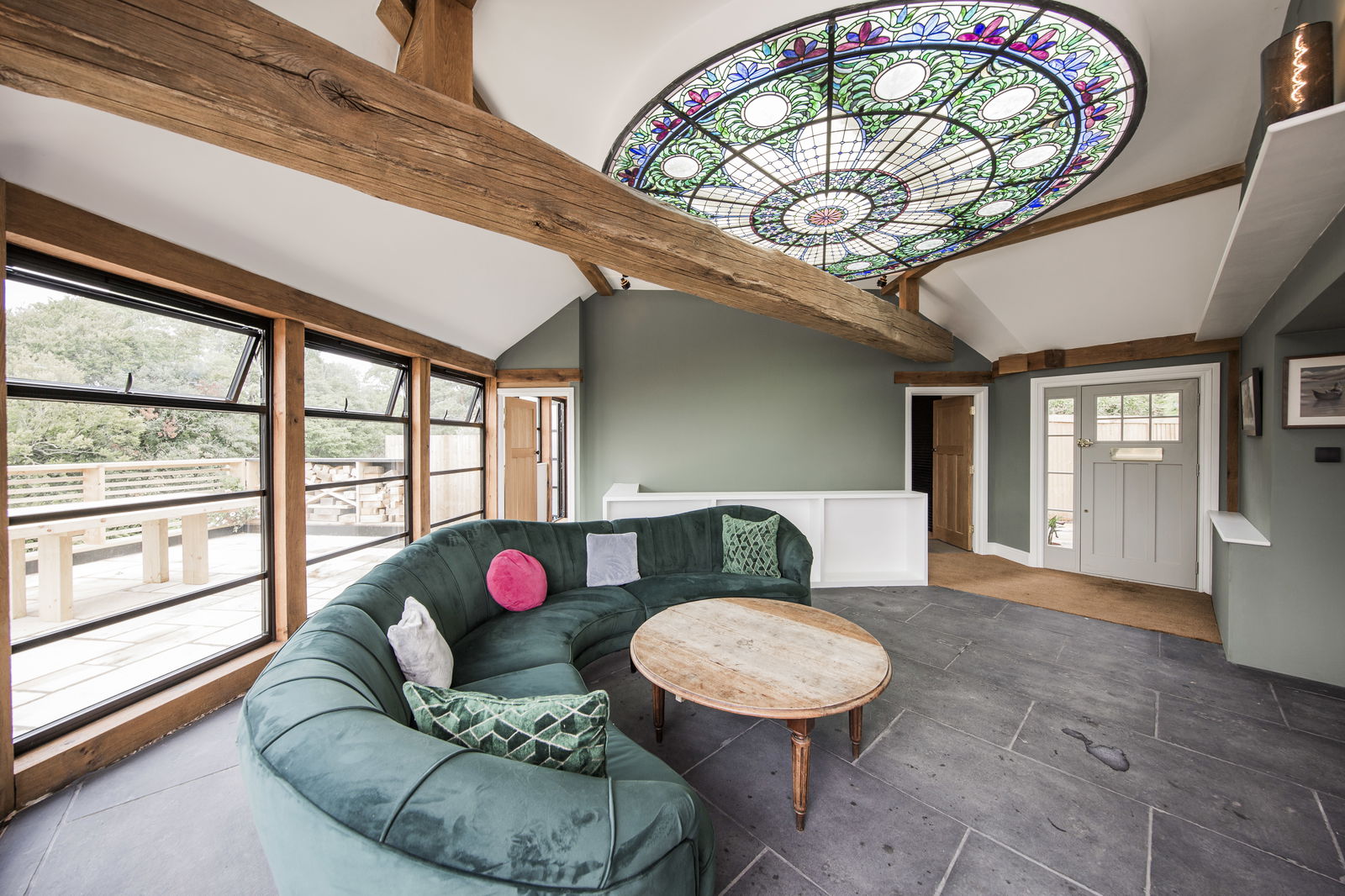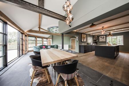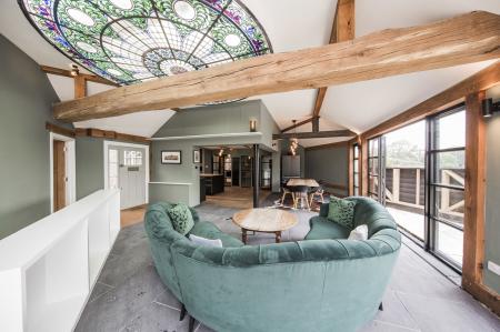 DINING ROOM/FAMILY ROOM Vaulted ceilings with oak beams and attractive stain glass window with coloured remote controlled backlit lighting, coir entrance matting, grey slate tiled flooring with underfloor heating, ample space for sofa seating and dining furniture with windows and patio doors open to a rear terrace.