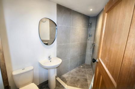 WET ROOM: Shower, pedestal sink, wc and walk-in cupboard.