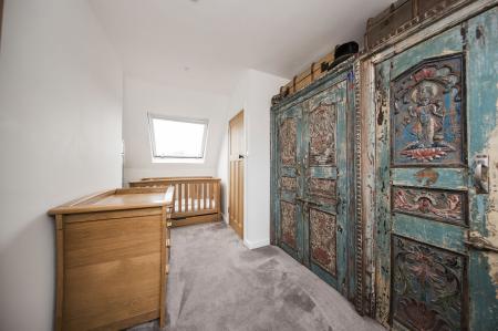 MAIN BEDROOM: (Limited head height ) Fitted carpet, door with direct access to loft space, large window to rear with views over garden and valley, three Velux windows, radiator and door into: