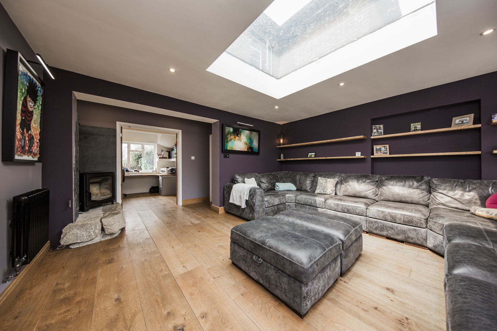 SITTING ROOM: Fireplace with stone plinth, three radiators, oak flooring, large skylight and two windows to front.