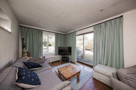 SITTING ROOM: Feature wood burner with brick surround, stone mantle and raised brick area, three column style radiators, exposed brick walling, timber flooring, sliding patio doors opening onto the rear garden and three further windows, two to side and one to rear.