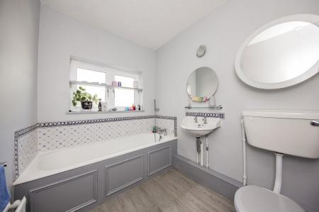 BATHROOM: Wood panelled bath with attractive tile surround and separate shower attachment, low level wc, wall mounted wash hand basin with mirror above, radiator, vinyl flooring and obscured window to rear.